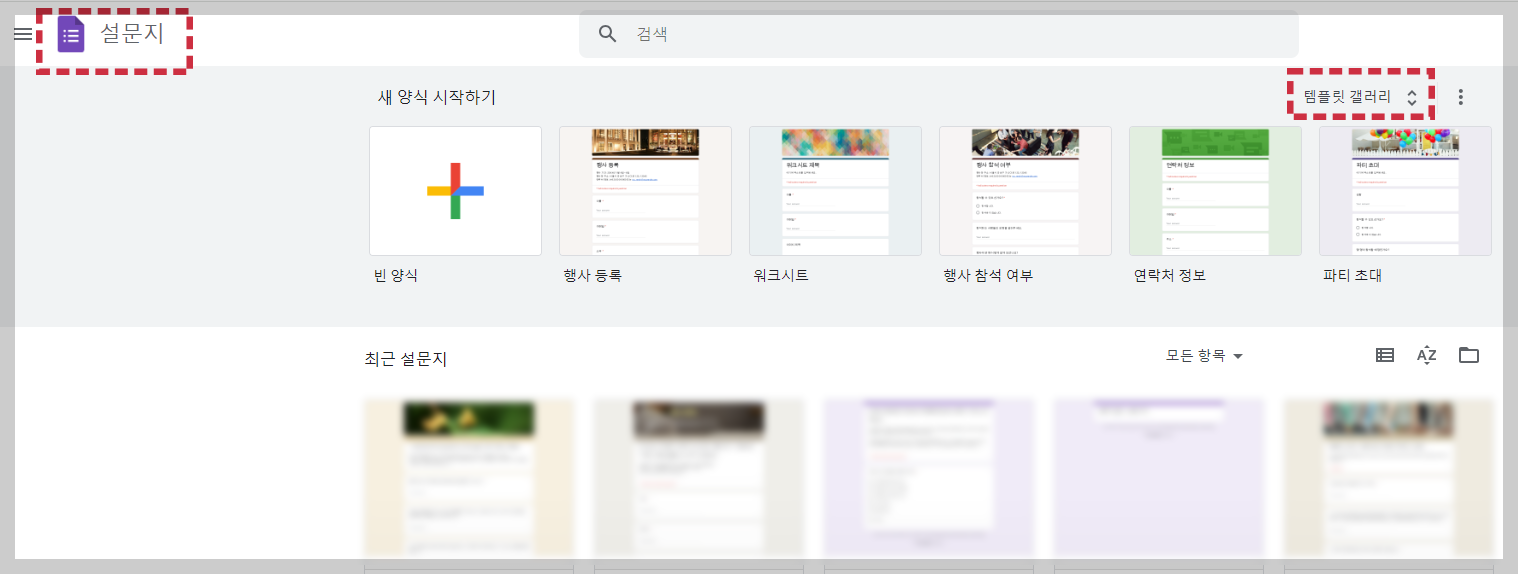 오른쪽 상단에 작은 글씨로 되어 있는 "템플릿 갤러리'를 클릭하시면 다양한 양식의 구글 폼을 만나실 수 있습니다.