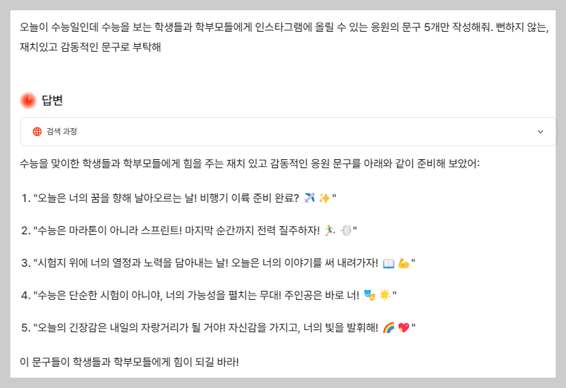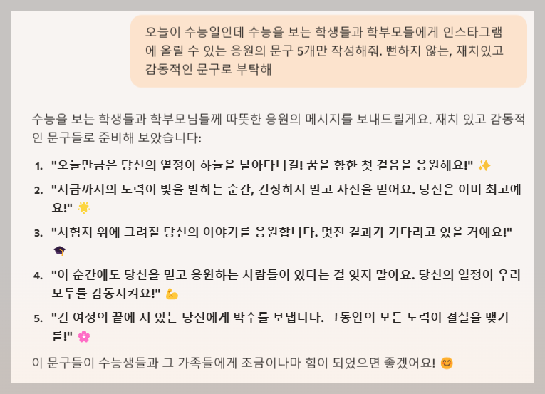 지금까지, 요즘 가장 잘 나가는 생성형 AI를 이용해서 수능 응원 문구를 만들어봤는데요. 여러분은 어떠신가요? 어떤  생성형 AI가 작성한 문구가 가장 마음에 드셨나요?