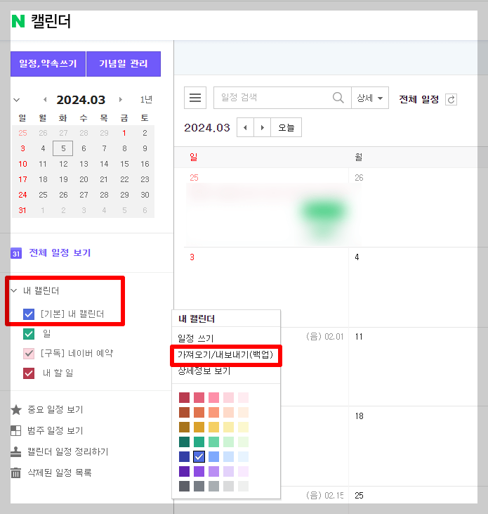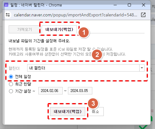네이버 캘린더 왼쪽에 있는 '내 캘린더 → 가져오기/내보내기(백업)'을 클릭해 주세요. 내보내기 팝업창이 뜨면, "내보내기(백업)"을 선택해 내보낼 파일의 기간을 설정해 주세요. 전체 일정으로 설정을 해 주셔도 되고, 사용자에 따라 필요한 기간을 설정하시면 됩니다.