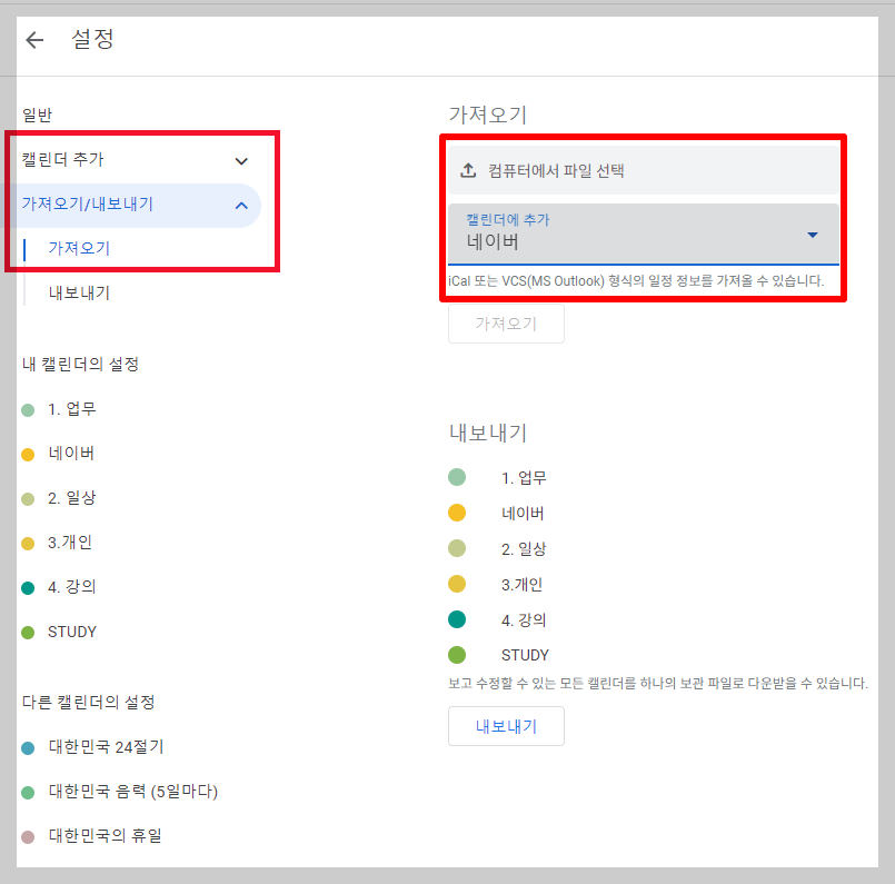 구글 캘린더에서 가져오기를 클릭하시면, '가져오기 → 컴퓨터에서 파일 선택'을 클릭해 네이버 캘린더에서 저장해 둔 백업 파일을 불러오시면 됩니다.