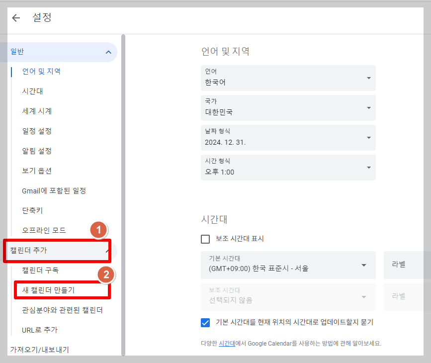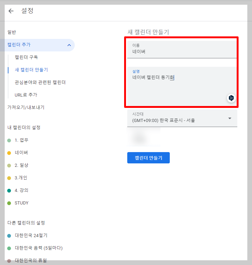 구글 캘린더 오른쪽 상단에 있는 톱니 바퀴 모양을 클릭해서 설정을 열어주세요. 여기서, '캘린더 추가 → 새 캘린더 만들기'를 해서 새 캘린더 이름에 '네이버'를 입력하고 '캘린더 만들기'를 클릭하시면 됩니다.