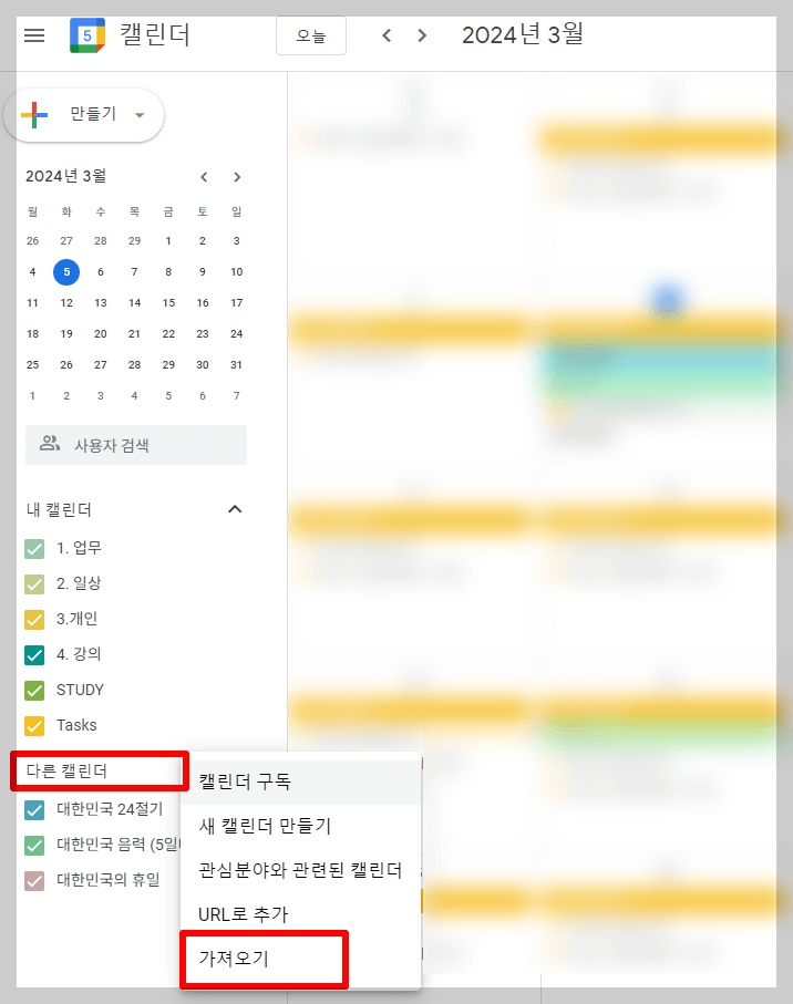 네이버 캘린더 내보내기(백업)가 끝났다면, 이제 구글 캘린더를 실행시켜 주세요. 구글 캘린더 왼쪽에 있는 '다른 캘린더 → 가져오기' 클릭해 주세요.