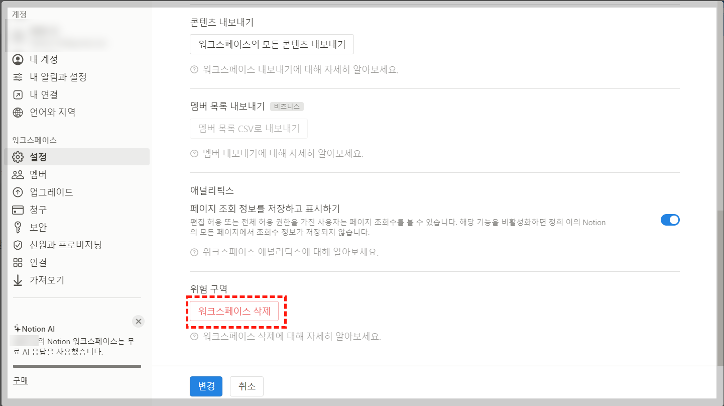 20번 이상 사용해도 노션 AI를 무료로 사용할 수 있는 방법이 있습니다. 바로, 설정에서 "워크스페이스 삭제"를 클릭해 주면 다시 20번까지 무료로 사용할 수 있습니다. 다만, 워크스페이스를 삭제하면 그동안 노션 AI에게 물어봤던 내용들이 전부 삭제됩니다. 그렇기에, 중요한 내용은 따로 저장해 두시기를 바랍니다.