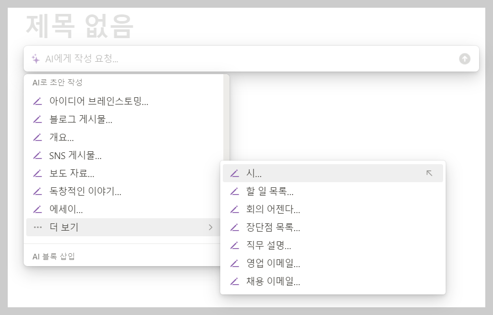 아이디어 브레인스토밍, 블로그 게시물, 개요, SNS 게시물, 보도자료, 에세이, 할 일 목록, 회의 어젠다, 장단점 목록, 영업 이메일, 채용 이메일...