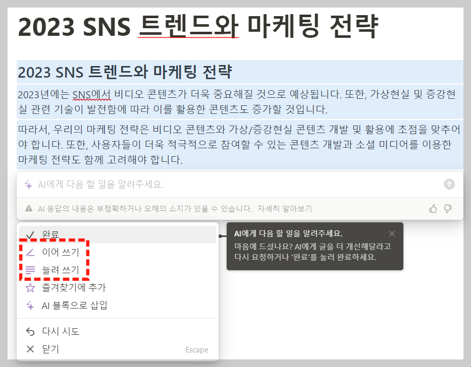 노션 AI 차별점, '이어 쓰기 & 늘려 쓰기'