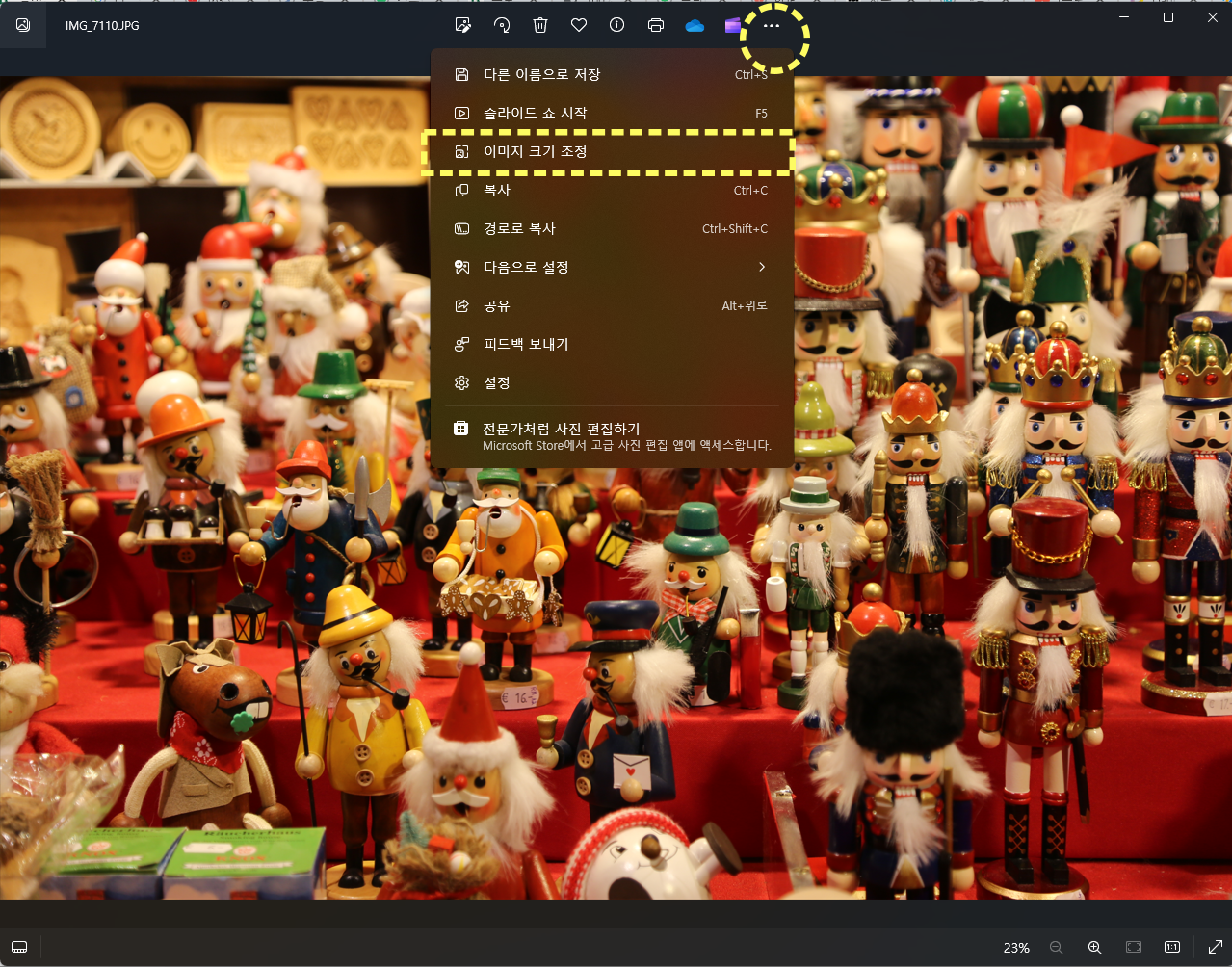 사진 파일을 열면, 상단 중앙에 사진을 편집하거나 인쇄, 휴지통 등 간단한 작업을 수행할 수 있는 아이콘 등이 보입니다. 거기에서 가장 오른쪽에 있는 점 세 개를 클릭해 주세요.