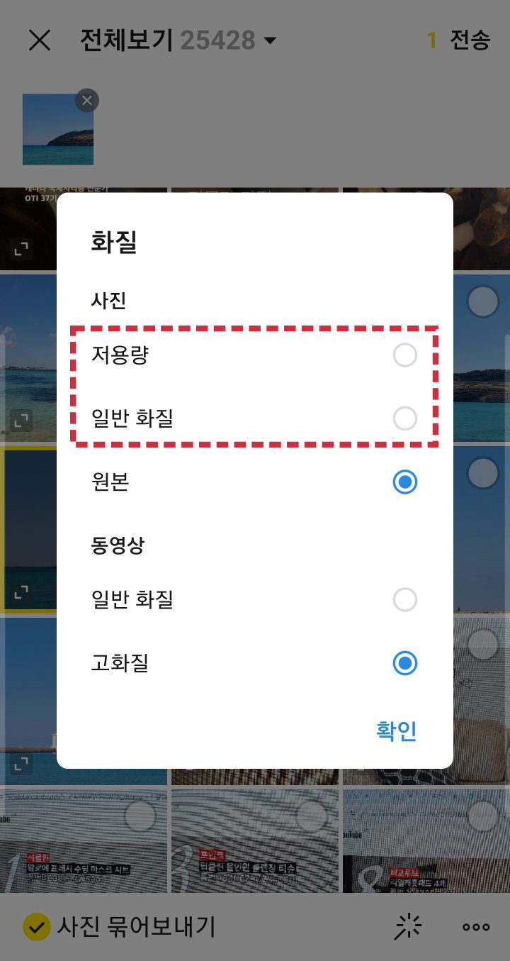 저용량 사진을 사용해야 하는 티스토리 블로그와 같은 경우가 아니라면 저는 원본 그대로 고화질을 선택해 사용하고 있는데요. 여기에서 저용량 일반화질로 바꾸어 주세요.