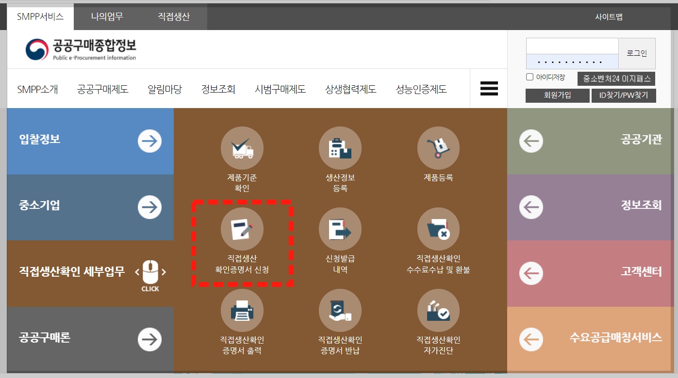 직접생산확인증명서(직생) 신청은, '공공구매종합정보' 사이트에서 하셔야 합니다.