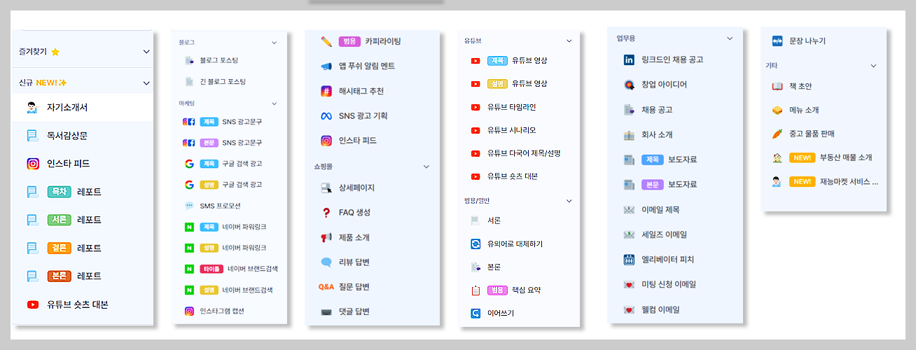 두번째는, 뤼튼(wrtn)만의 가장 크 차별점이라고 할 수 있는 "툴"이 있습니다. 자기소개서, 독서 감상문, SNS 피드, 리포트, 유튜브 숏츠 대본, 블로그 포스팅, SNS 광고 문구, 구글 광고, SMS  프로모션, 영어 메일, 해시태그 추천, SNS 광고 기획, 상세페이지, 제품소개,  리뷰 답변까지 클릭 한 번으로 이 모든 걸 무료로 다 할 수 있는 있습니다.