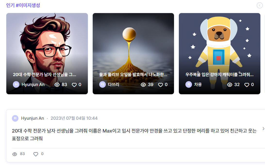 뤼튼(wrtn)의 장점은 무료로 이미지를 생성할 수 있어서 자주 사용하게 되는 것 같습니다. 그림 그려주는 AI를 사용해 보고, 이 중 개인의 성향에 맞는 것으로 사용하면 될 것 같습니다. 아래 이미지는, 뤼튼(wrtn)에서 사용자들이 올린 이미지 생성 예입니다.