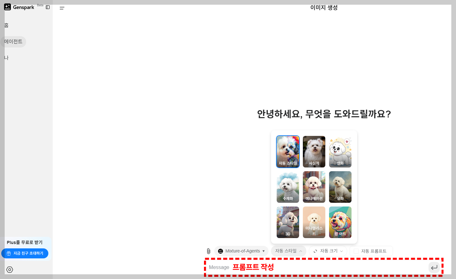 여기서 잠깐, 젠스파크로 몇 번 이미지를 생성하다 보면 무료 사용 횟수에 제한이 걸려 더 이상 이미지 생성이 안되실 텐데요. 이럴 때는 젠스파크 AI 왼쪽 하단에 보시면 'Plus를 무료로 받기' 글씨가 보이실 거예요.