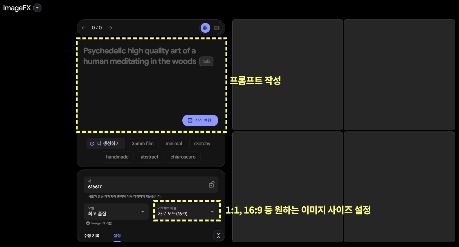 아래 이미지에서 빨간색으로 체크되어 있는 부분에 프롬프트를 작성해 넣으면 되는데요. 프롬프트는 위에서 이마젠3에 사용하였던 프롬프트를 그대로 사용하시면 됩니다.