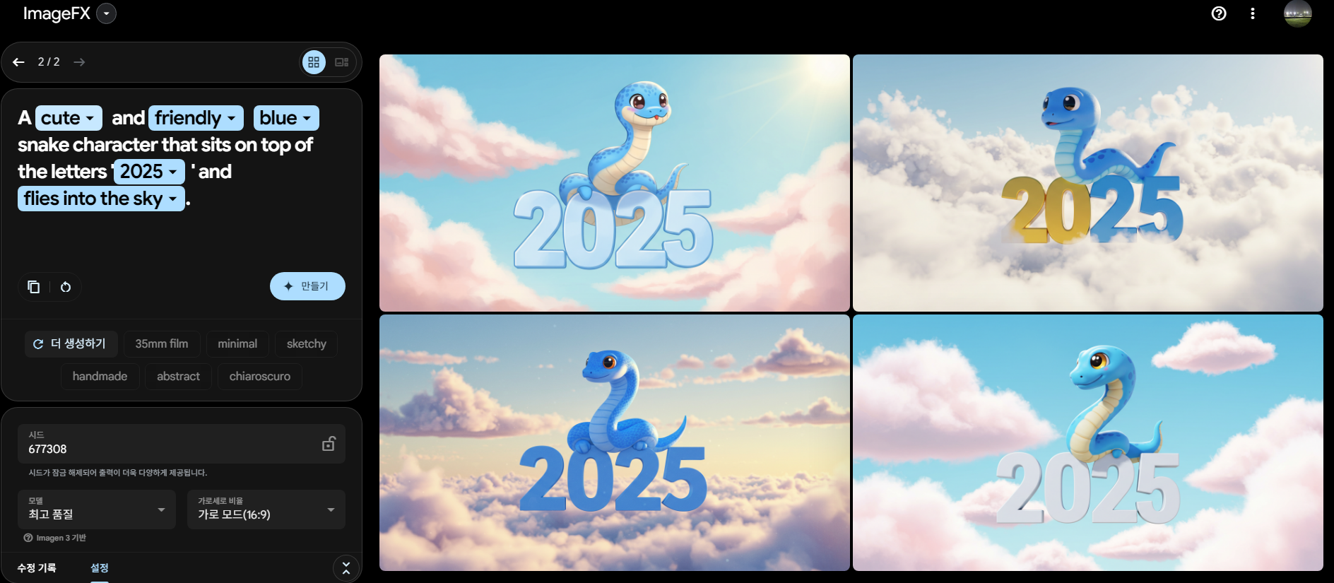 위에, 이마젠3 프롬프트 칸에 하늘색으로 되어있는 단어들을 조금만 바꿔도 이미지 생성이 달라집니다. 예를 들어 'blue → green'으로 바꾸면 푸른색 뱀 캐릭터 대신 초록색 뱀 캐릭터가 생성될 것입니다.