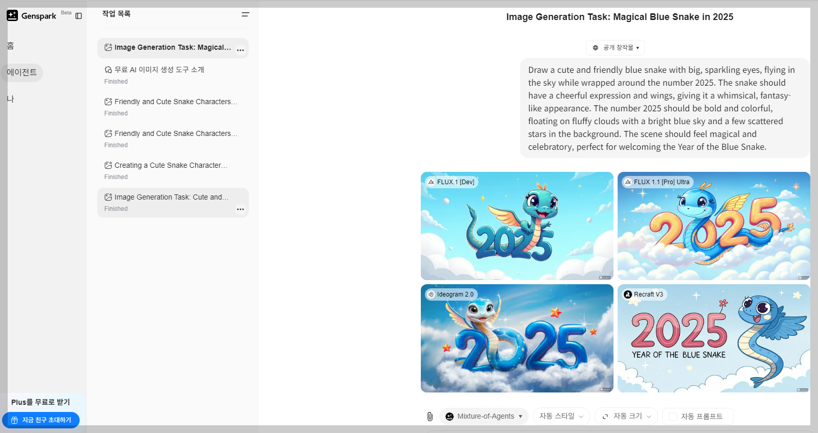 그중에서 무료로, 제가 원하는 퀼리티의 푸른 뱀 캐릭터를 만들 수 있는 AI 이미지 생성 사이트는 구글의 이마젠3와 젠스파크였습니다.