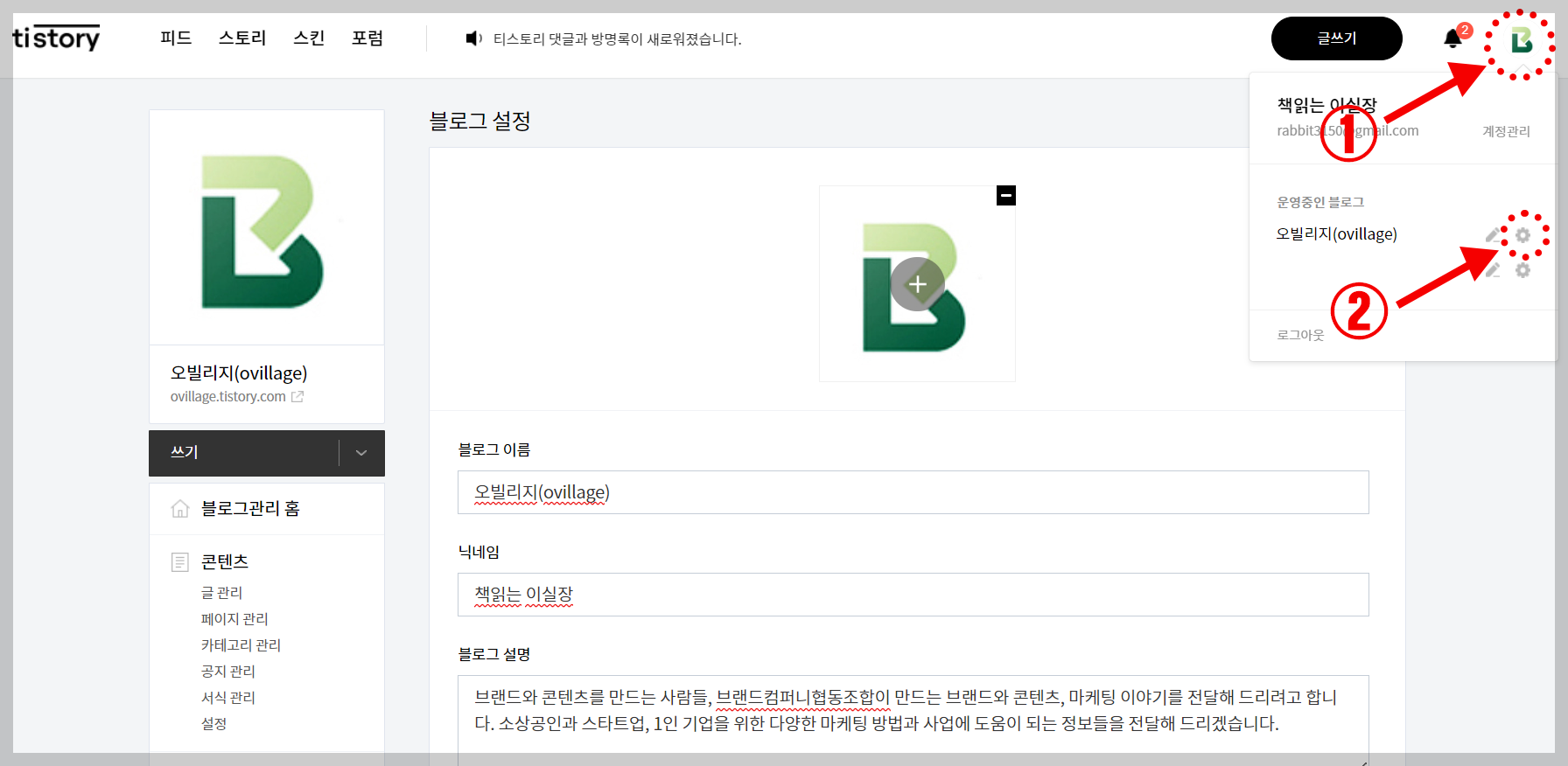 티스토리 블로그 관리자 홈에 들어가면 왼쪽 하단에 "관리 → 블로그"를 클릭해 주세요. 이곳에서 블로그 이름과 닉네임, 블로그 설명을 적어주시면 됩니다.