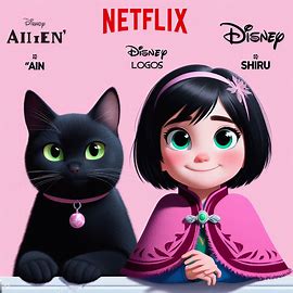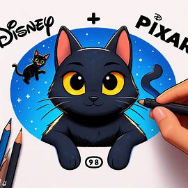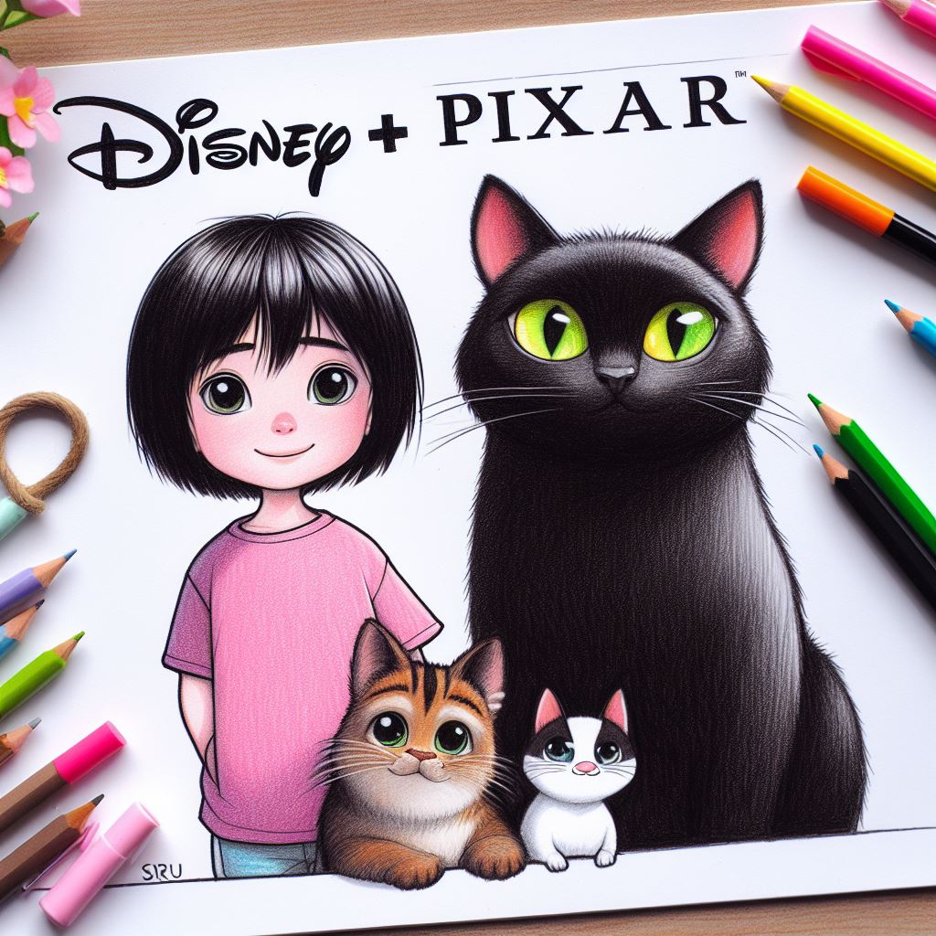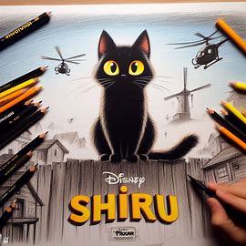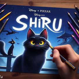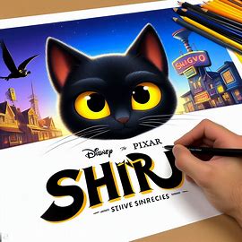"Draw an animated movie poster with the Disney and Pixar logos, a black cat with yellow eyes, and the title is Shiru."