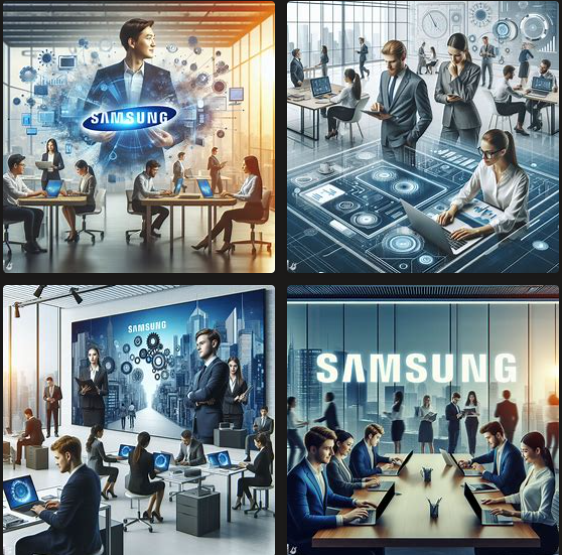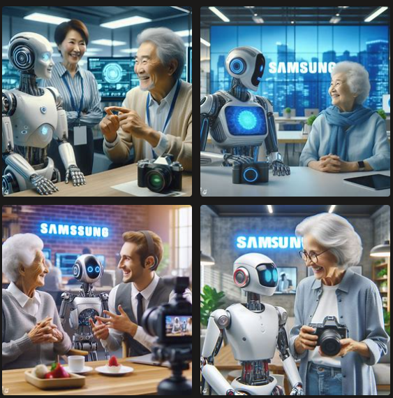 삼성 노트북이 있는 첨단 사무실을 배경으로, 남녀 직원이 일하는 모습과 또 하나는 로봇과 할머니가 첨단 사무실에서 웃으며 이야기하는 모습을 만들어 달라고 한글 프롬프트로 입력해 만들어봤습니다.