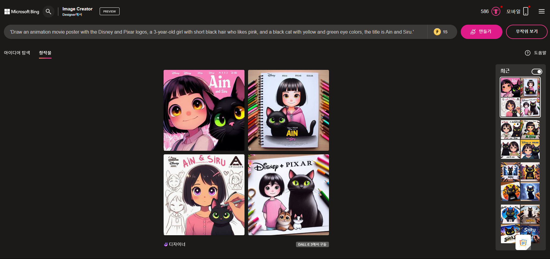 오늘은, 빙 이미지 크리에이터를 이용해 저희집 아이와 고양이를 모델로 디즈니와 넷플릭스 로고가 삽입된 애니메이션 영화 포스터를 만들어 보겠습니다. 먼저, 구글이나 네이버에 '빙 이미지 크리에이터'를 검색해 클릭해 주세요!