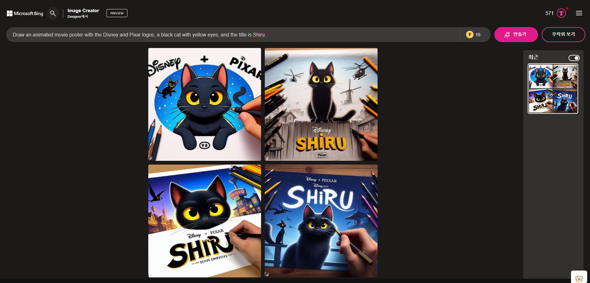 "디즈니와 픽사 로고가 삽입된, 노란색 눈동자를 가진 검은색 고양이 '시루'를 주인공으로 애니메이션 영화 포스터 만들어줘?"라는 프롬프트를 챗gpt나 네이버 파파고, 구글 번역기에 입력해 얻은 영어 프롬프트를 '빙 이미지 크리에이터'에 복사 붙여 넣기로 해서 얻은 AI 이미지 결과물입니다.