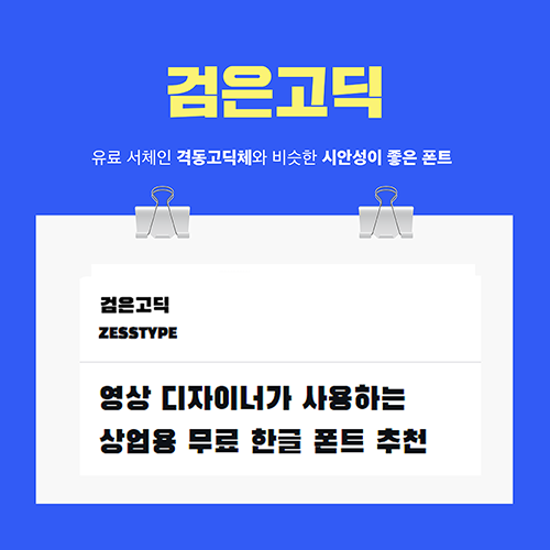 유료 서체인 산돌폰트의 격동고딕체와 비슷한 느낌을 줄 수 있는 검은고딕체는 시안성이 좋은 폰트로 유튜브 썸네일에 가장 많이 사용하는 서체 중 하나입니다. 숫자나 영문으로 사용해도 예쁜 폰트로 굵기가 두꺼워서 너무 작은 글씨에는 사용하지 않는 게 좋습니다.
