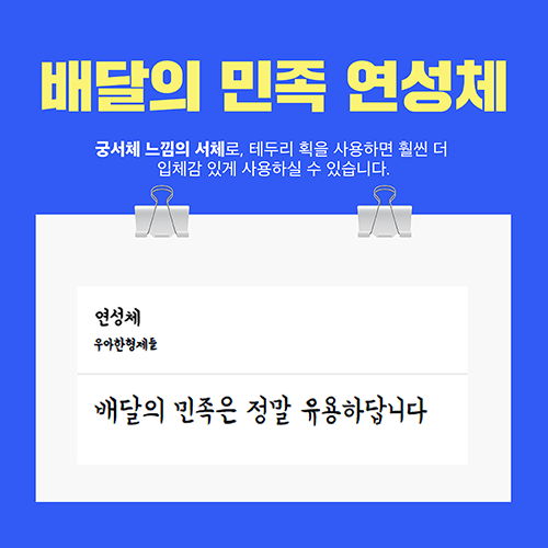 배달의 민족 연성체는, 배달의 민족 폰트 3대장(도현체, 한나체, 주아체)과 함께 유튜브나 릴스 등 영상 자막에 많이 사용하는 폰트입니다. 궁서체 느낌의 서체로, 테두리 획을 사용하면 훨씬 더 입체감 있게 사용하실 수 있습니다.