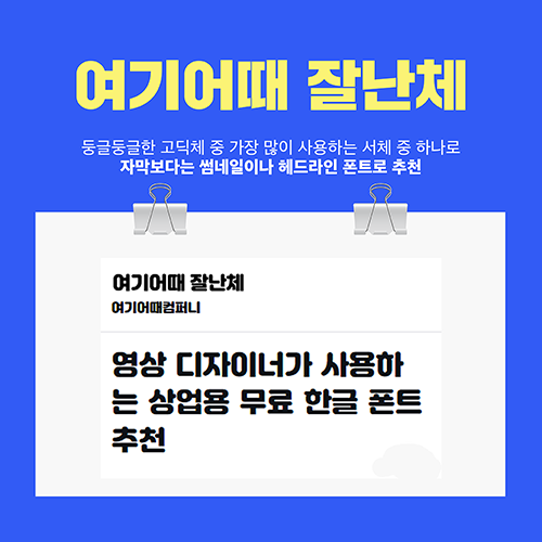 둥글둥글한 고딕체 중에서 가장 많이 사용하는 서체 중 하나인 여기어때 잘난체는 자막보다는 썸네일이나 헤드라인 폰트로 추천드립니다. 유튜브에서 많이 사용하는 폰트 중 하나입니다.