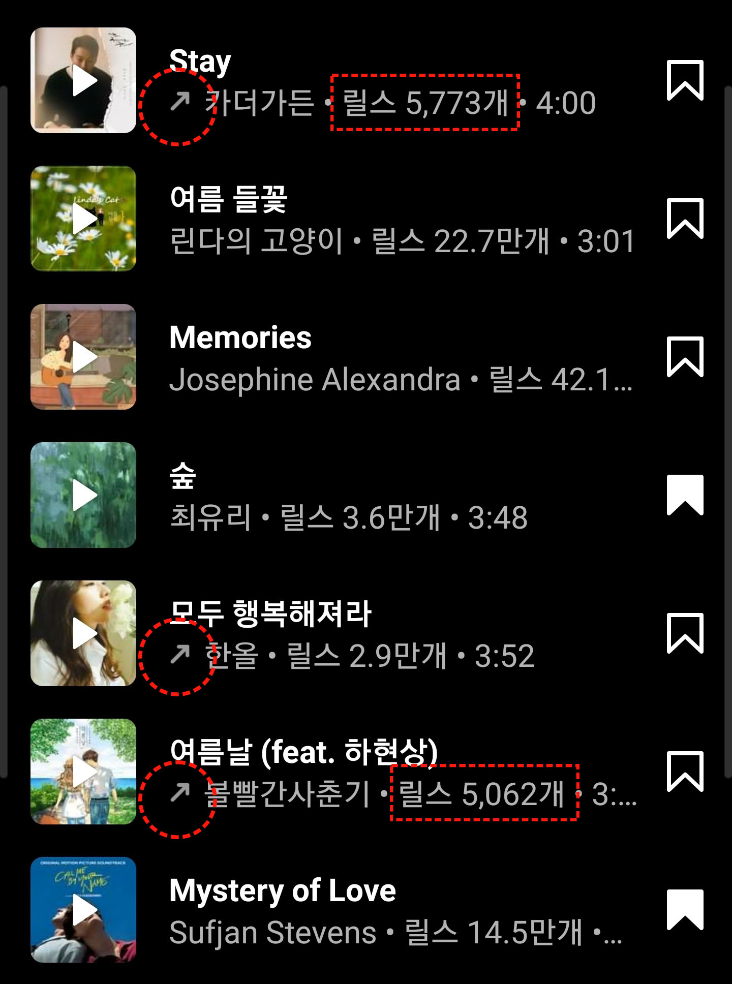 복잡하다고요? 복잡하지 않습니다. 인스타그램 릴스 음원을 선택할 때는 인스타그램에서 공식적으로 뜨고 있는 화살표가 있는 음원 중에서 사용 개수가 최소 3만 이하의 음원을 선택하시면 되는 겁니다.