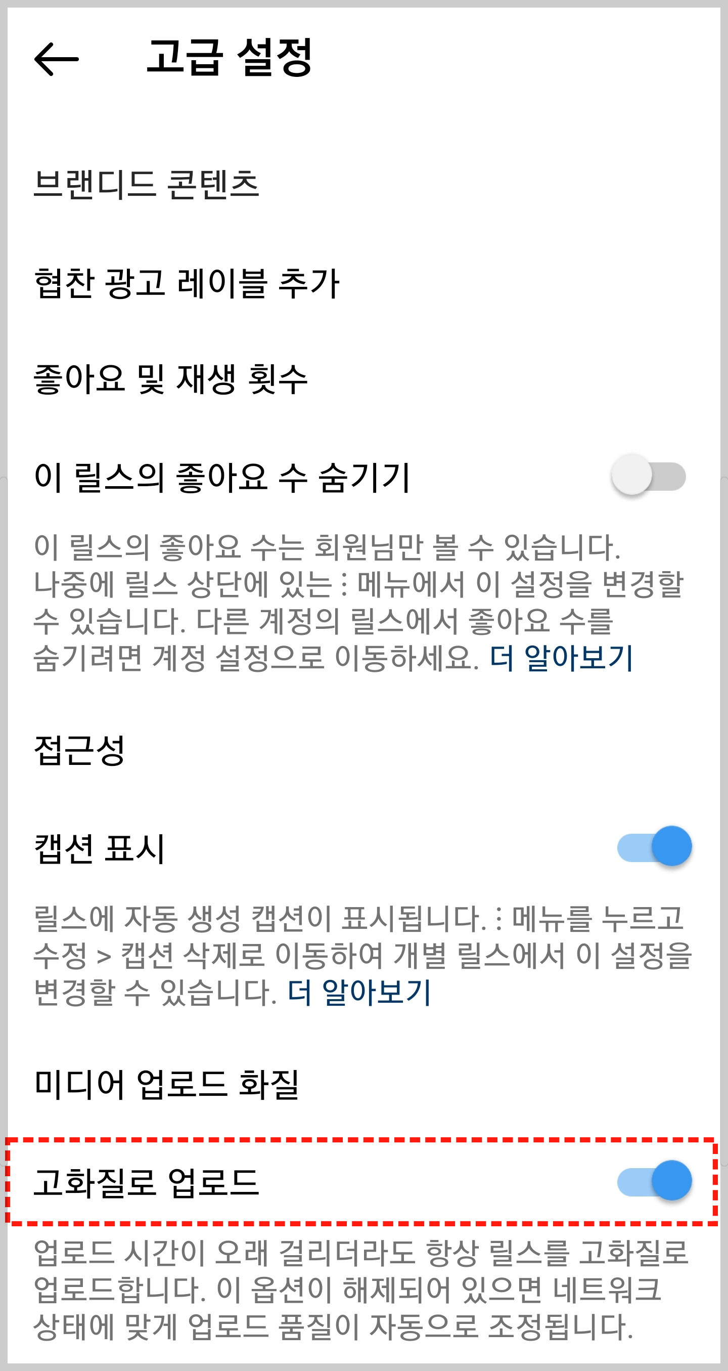 인스타그램 릴스 업로드 설정 중에 있는 '고급 설정' 중에 하나인 "고화질 업로드' 기능은 따로 부가 설명을 드리지 않아도 될 만큼 이름만으로도 설명이 되는 기능인데요. 고화질 업로드 기능도, 기본 설정 기능으로 생각하시면 됩니다.
