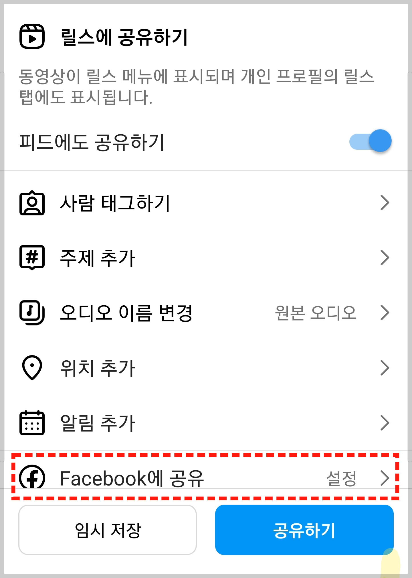 인스타그램 릴스뿐 아니라 게시물을 페이스북에 추천 허용하는 기능입니다. 이 기능 역시 설명이 필요 없는 기능인데요. '다다익선'이라는 말이 있듯이 인스타그램뿐 아니라 페이스북에도 내 게시물이 공유가 된다면 굳이 안 할 이유가 없는 기능입니다.