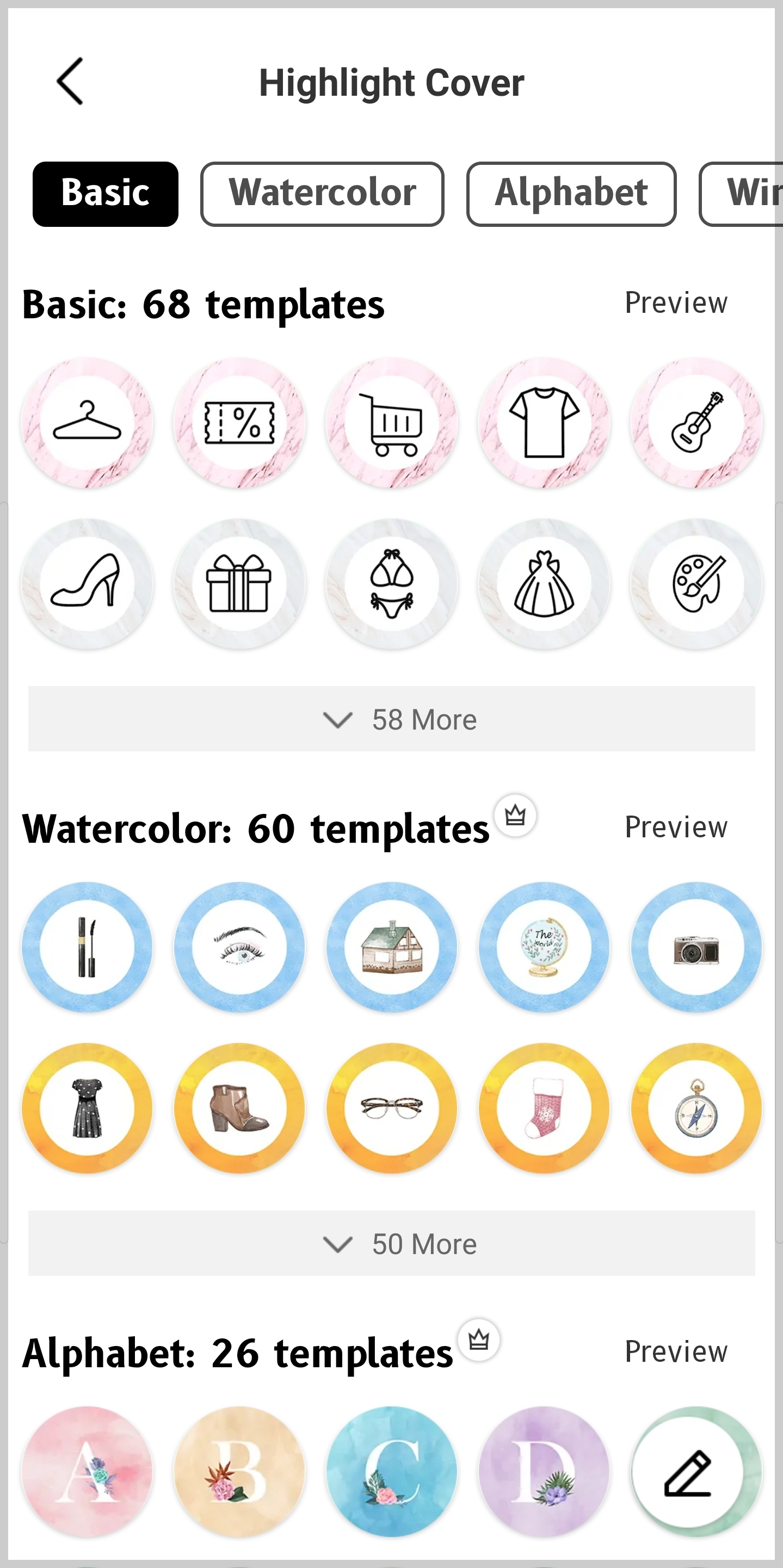'Hightlight Cover'(하이라이트 커버)를 클릭하면, 상단에 Basic, Watercolor, Alphabet 등 다양한 주제의 하이라이트 커버 디자인을 만날 수 있는데요. 이중에 하나를 클릭해 선택하시면 됩니다.