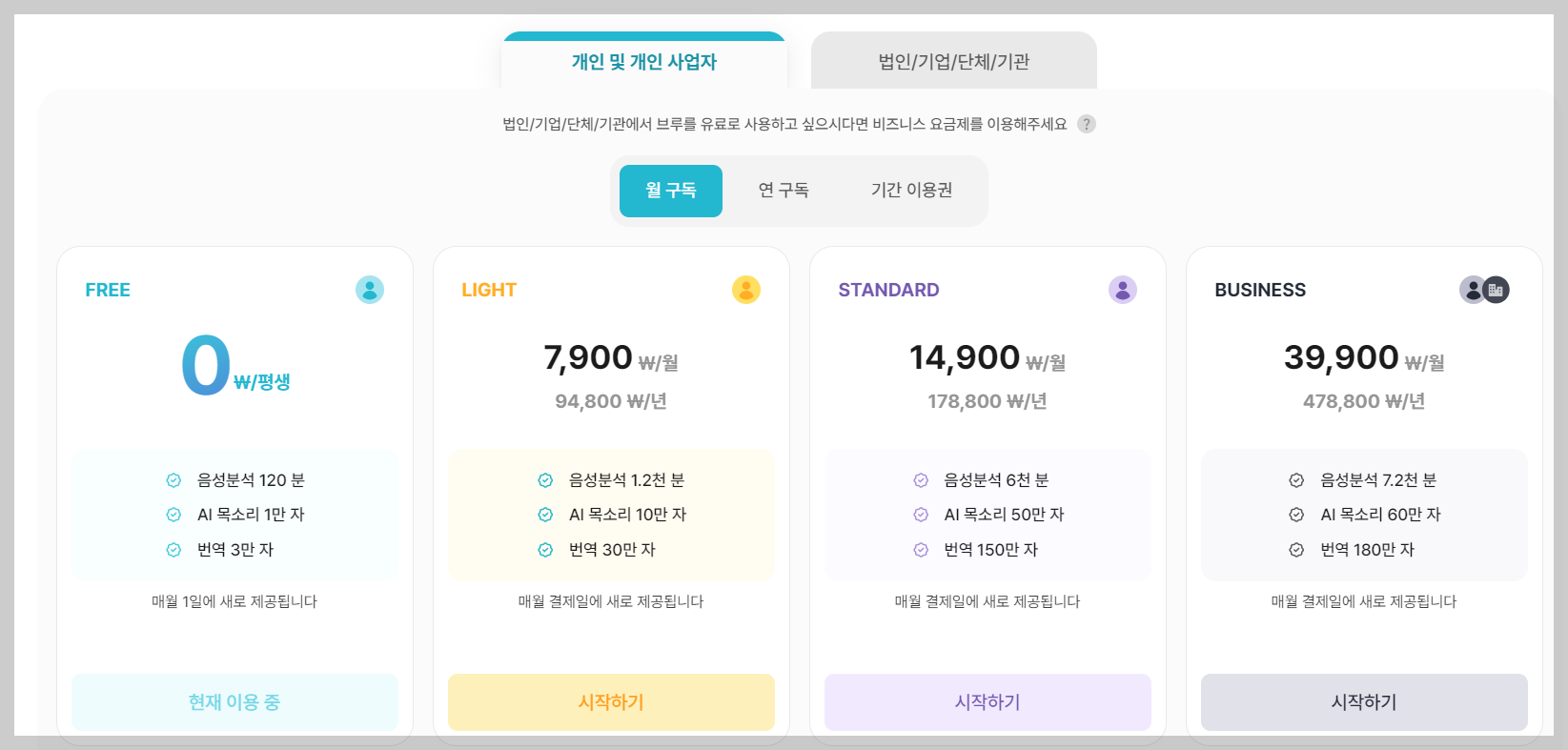 브루(VREW)가 지난 5월부터 일부 서비스가 유료화로 바뀌었는데요. 지금까지 저희가 무료 버전으로 사용한 것처럼 무료 버전으로 사용을 해도 영상 제작에는 크게 지장이 없습니다. 다만, 영상 제작이 많아질 경우에는 유료 버전을 사용하실 것을 추천 드리는데요. 개인인 경우, 한 달에 7900원 정도 사용하실 수 있는 것으로 나오네요.
