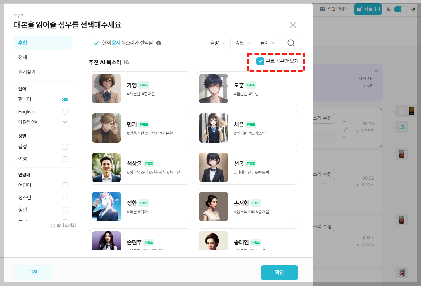 AI 목소리 성우는 유료와 무료가 있는데요. 화면 상단에 있는 "무료 성우만 보기"를 체크해 주시면 무료로 사용할 수 있는 AI 성우 리스트가 나옵니다. 이 중에서 소리를 들어보고 선택하시면 됩니다.
