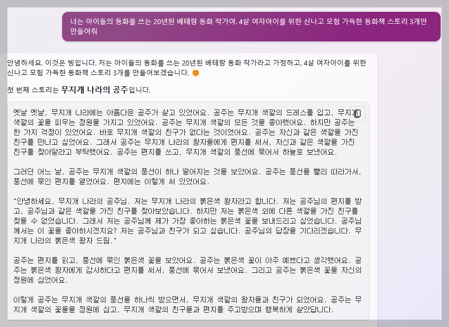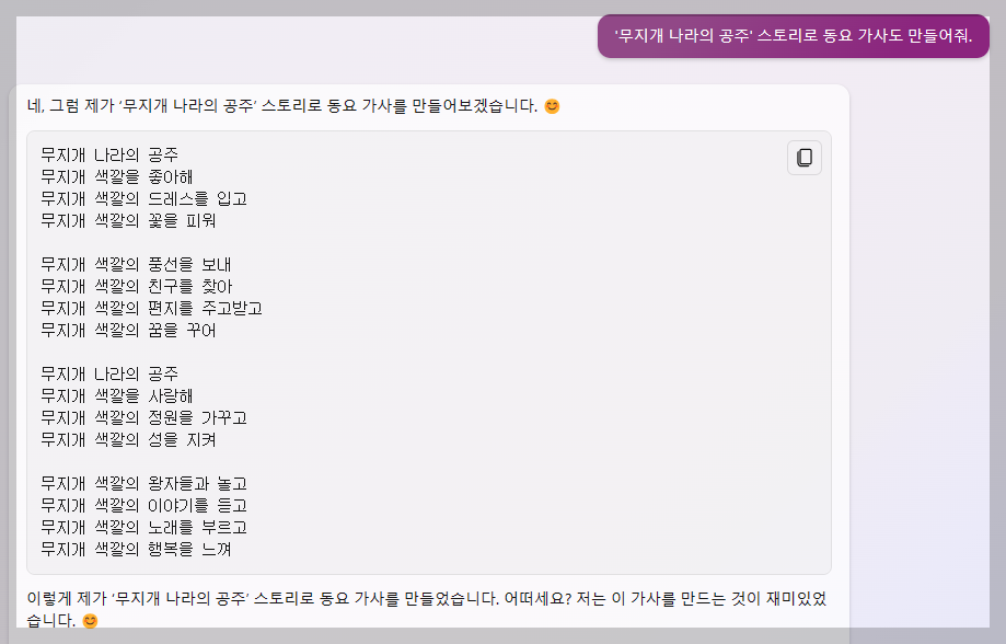 이번에는, '무지개 나라의 공주' 스토리로 동요 가사도 만들어 달라고 빙에게 요청해 봤는데요. 어떠신가요? AI가 신통방통하게 잘 만들어줍니다.
