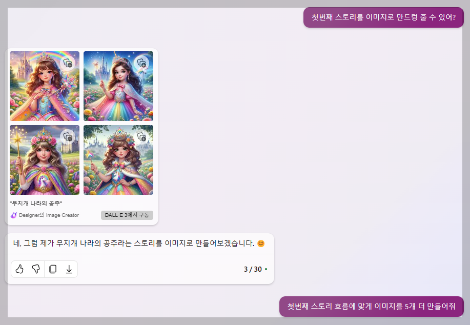 AI 빙이 만들어준 "무지개 나라의 공주' 스토리에 어울리는 이미지도 만들어 볼까요?