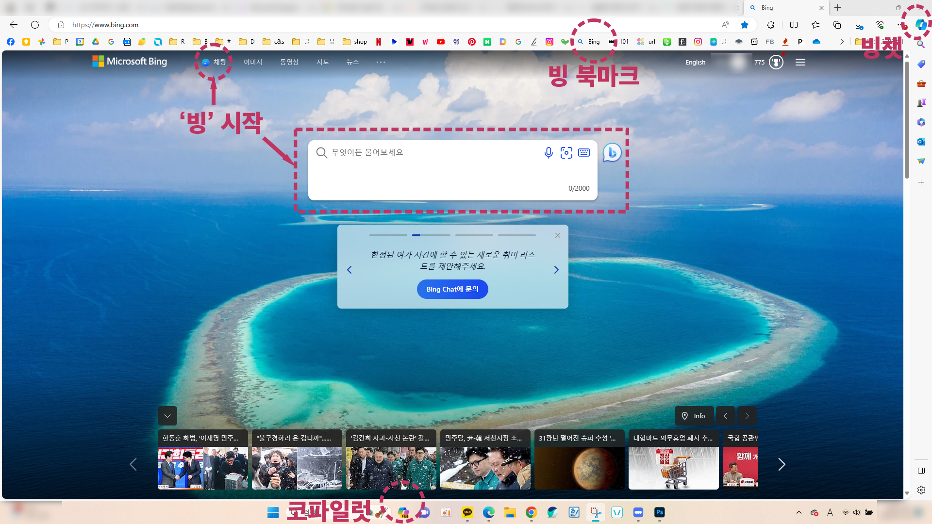 화면 상단 오른쪽 끝에 있는 푸른색 빙챗 로고를 클릭하시거나 작업표시줄에 있는 코파일럿을 클릭하셔도 되는데, 빙 홈페이지보다 화면이 작아 불편하실 수 있습니다, 하지만, 동화책 스토리 작성 및 무료 이미지 생성은 가능합니다.