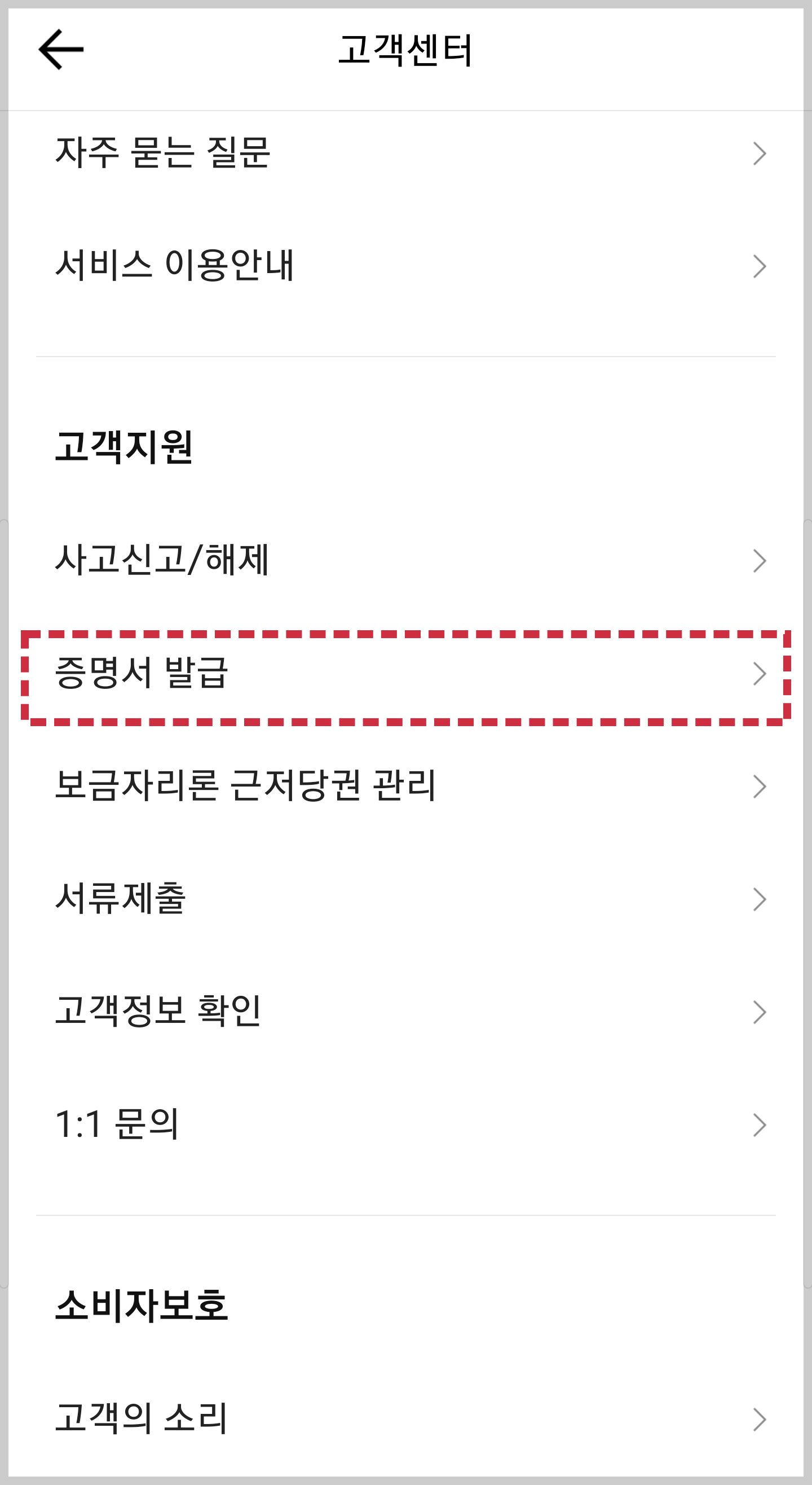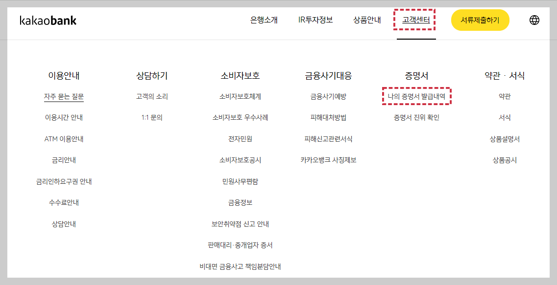 카카오뱅크 홈페이지에 들어가면, 상단 고객센터 → 증명서 → '나의 증명서 발급' 클릭하면 로그인을 통해 모바일 앱에서 신청한 증명서를 확인할 수 있는데요.