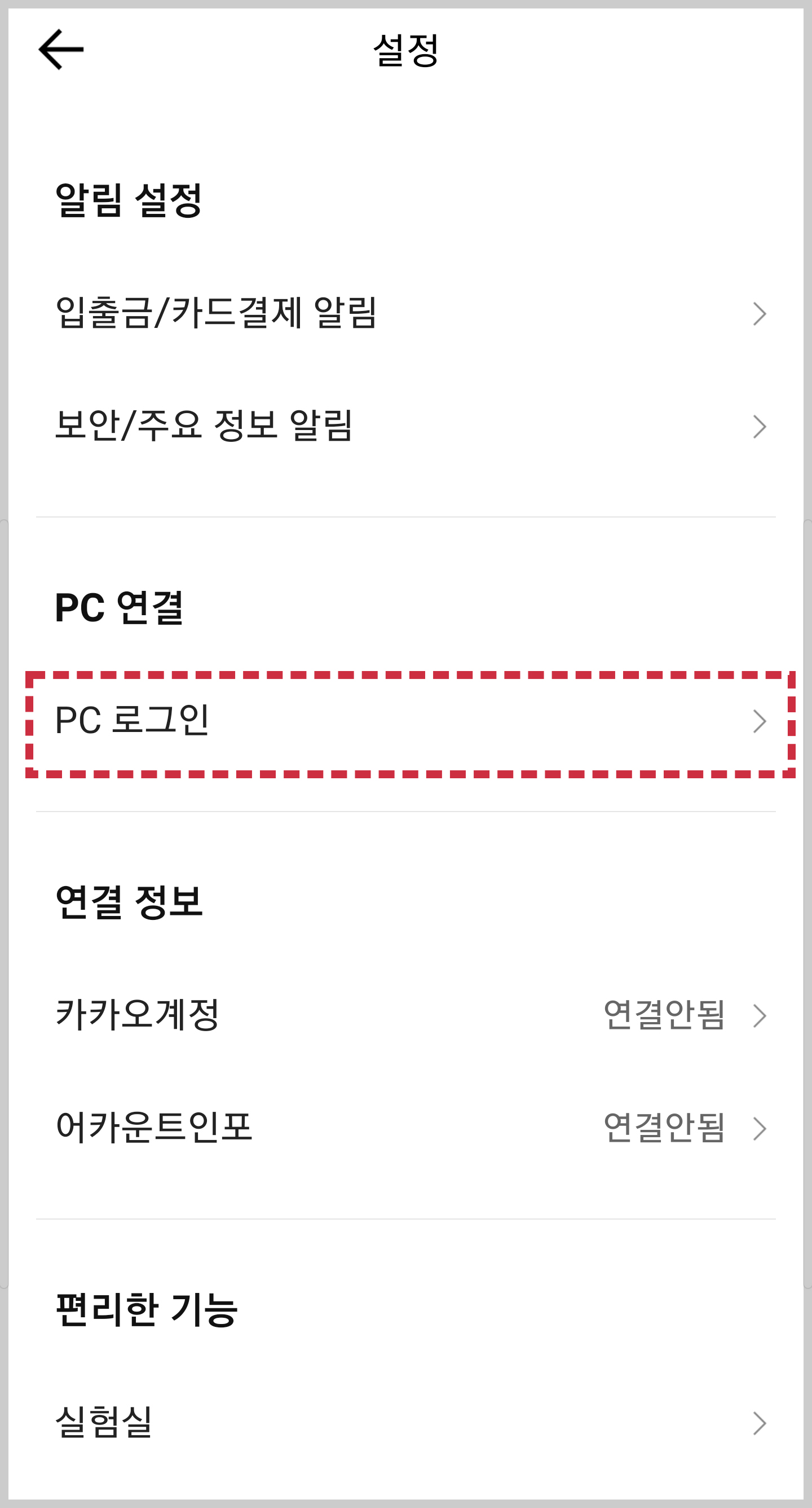핸드폰에 있는 카카오뱅크 앱 홈 화면에서 오른쪽 하단에 있는 점 세개 더보기를 클릭하면 우측 상단에 '앱설정'이 나타납니다. 앱설정 → PC로그인 → QR코드 로그인이나 인증번호 로그인을 선택하시면 됩니다.