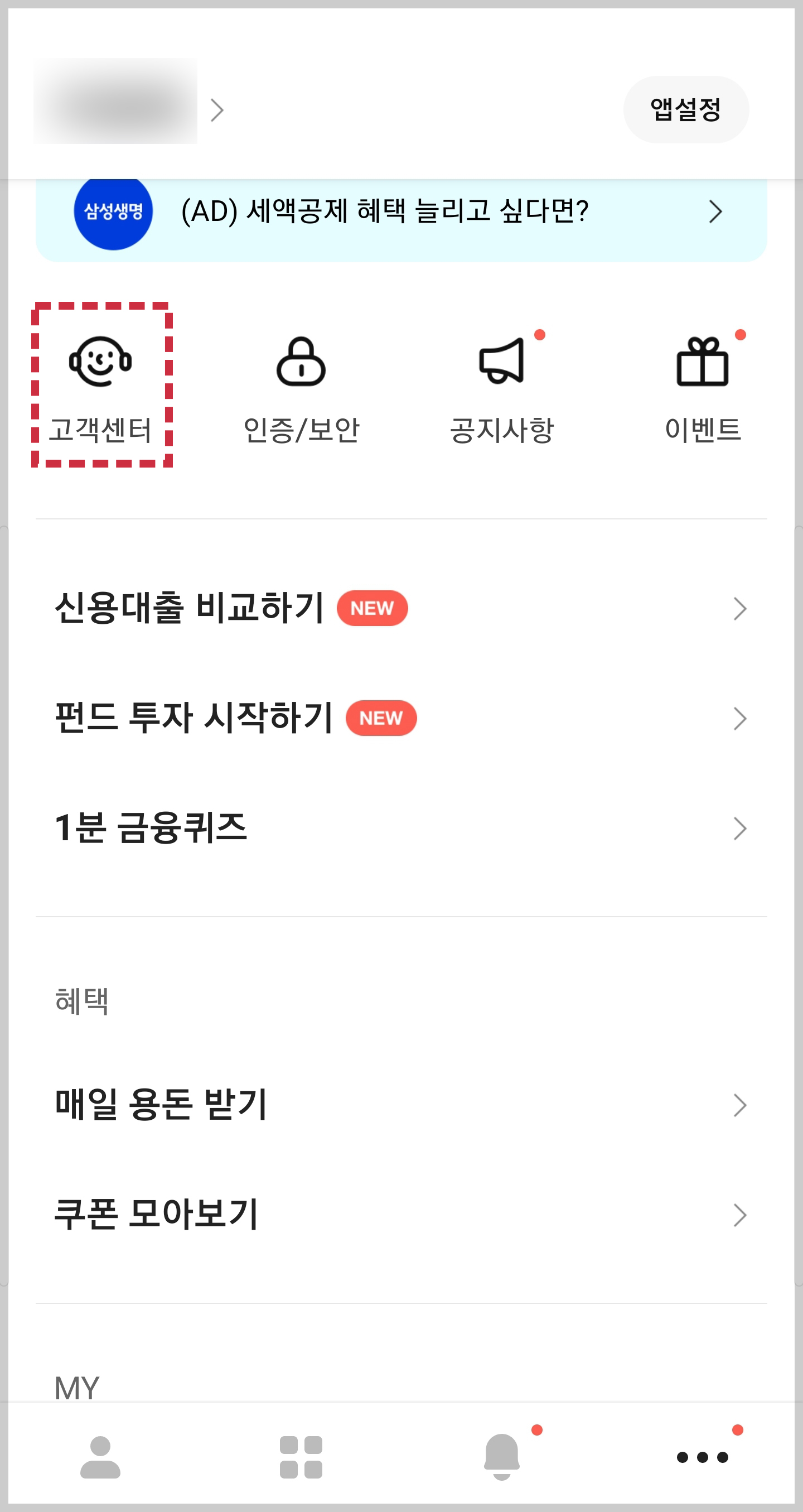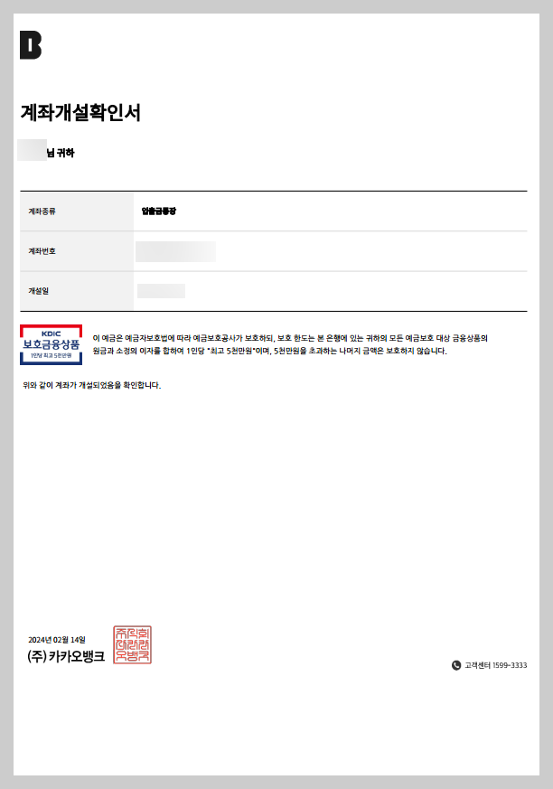 카카오뱅크 통장을 실행하면, 오른쪽 하단에 있는 점 세 개를 클릭 → 고객센터 → 증명서 발급 → '계좌 개설 확인서'까지 클릭하면 증명서 신청이 완료됩니다.