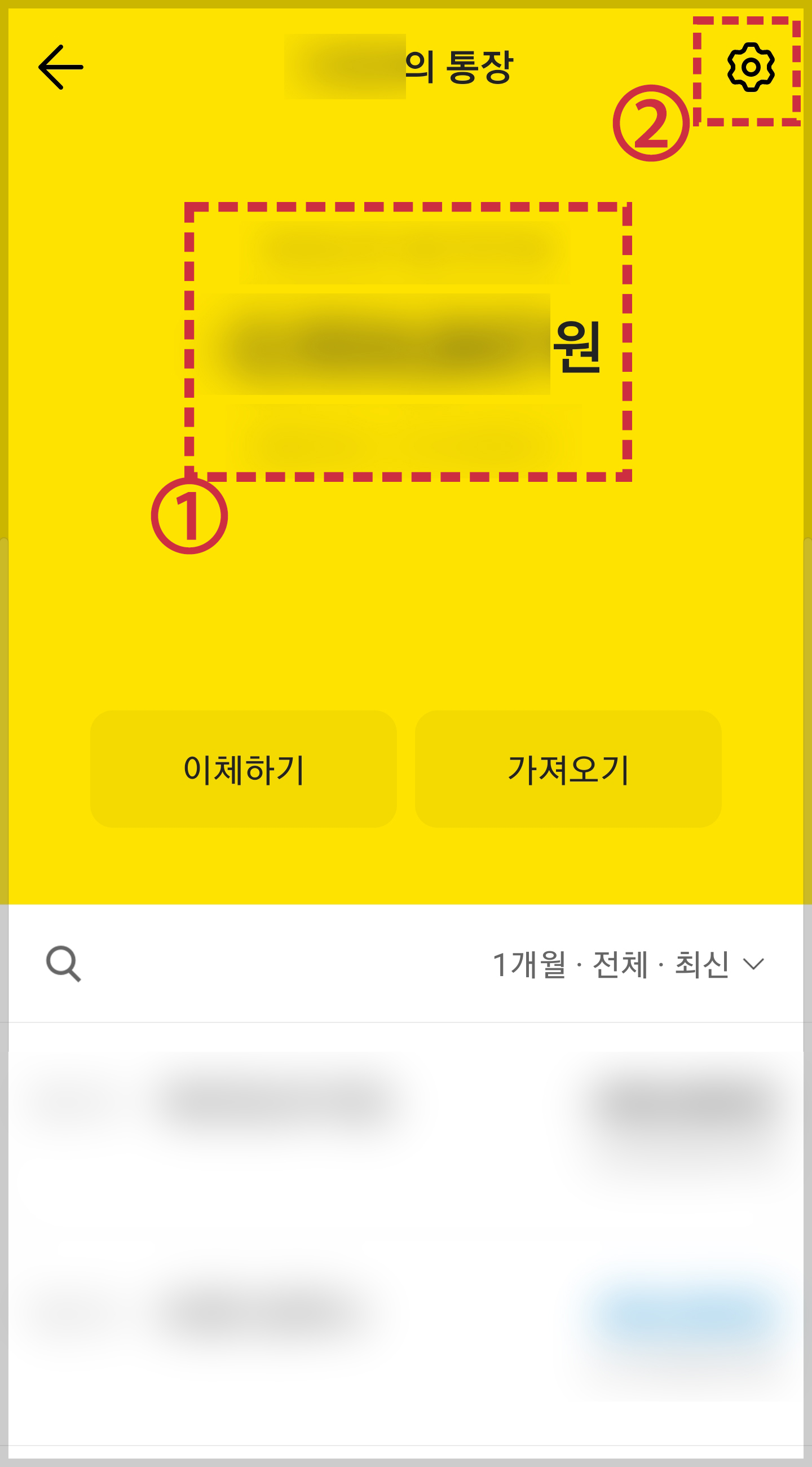 먼저, 핸드폰에 있는 카카오뱅크 통장을 클릭해 실행시켜 주세요. 화면 중앙에 있는 내 통장 클릭 → 오른쪽 상단에 있는 톱니바퀴 설정 아이콘을 클릭하면 '계좌관리'가 나오는데요.