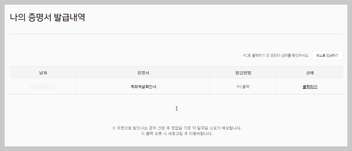 신청을 완료한 '계좌 개설 확인서'는, 우편으로 받거나 PC에서 출력할 수 있는 방법이 있는데요. 많은 분들이 선택하는 PC 출력 방법으로 진행해 봤습니다.