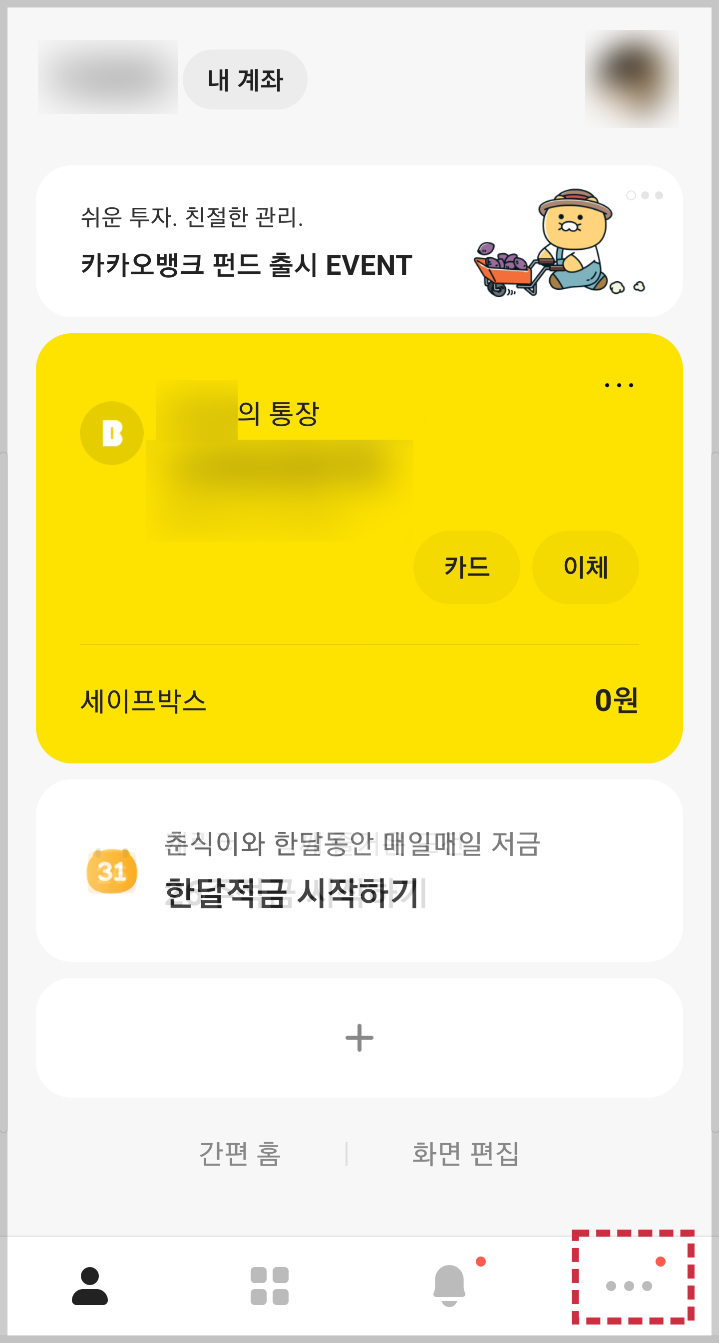 카카오뱅크 통장을 실행하면, 오른쪽 하단에 있는 점 세 개를 클릭 → 고객센터 → 증명서 발급 → '계좌 개설 확인서'까지 클릭하면 증명서 신청이 완료됩니다.