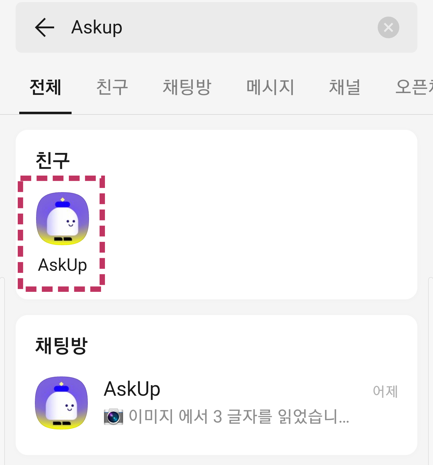 카카오톡 앱을 열어서, 상단에 있는 검색 아이콘(돋보기 모양)을 클릭해 Askup 입력해 친구 추가해 주시면 됩니다.