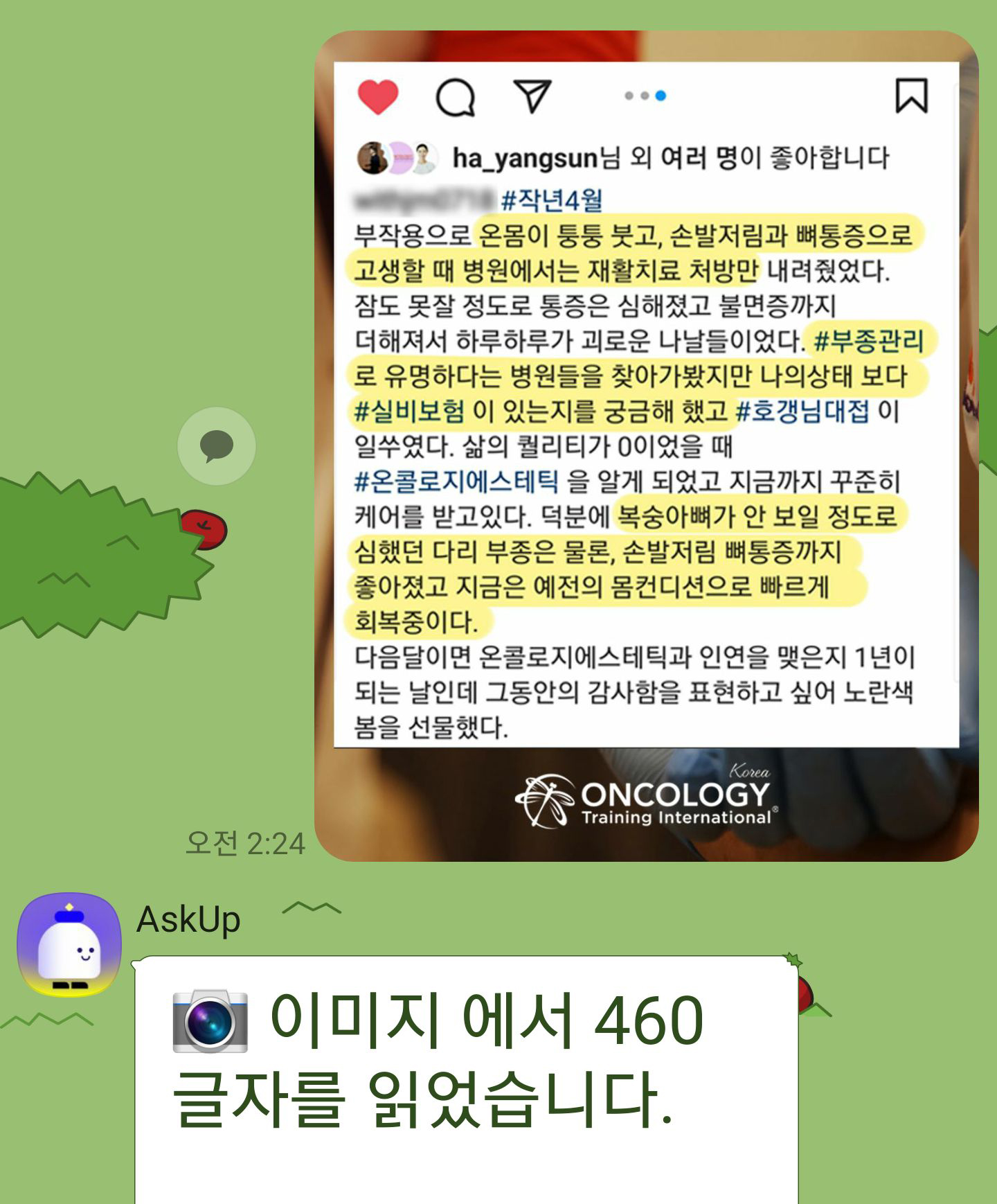 AskUp(아숙업)은 광학문자인식 OCR 기술을 결합해, 글자가 쓰여있는 문서의 사진이나 이미지를 올린 후 "요약해 줘'라고 말하면 이미지(문서) 속 내용을 요약해 주는 기능입니다.