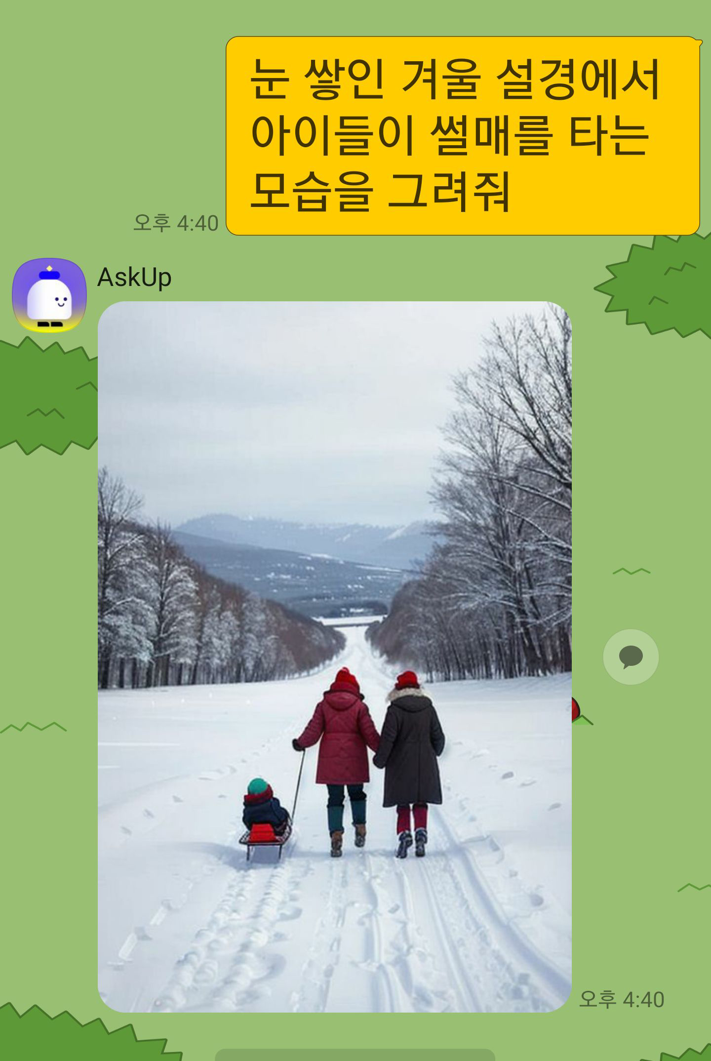 하지만, 스마트폰에서 한글을 이용해 AI 이미지를 그려주는 프로그램은 아직(2024.1.26)까지 뤼튼과 코파일럿, AskUp(아숙업) 세 가지 정도인데요. 그중에서도 앱을 다운로드하아야 하는 뤼튼이나 코파일럿에 비해 AskUp(아숙업)은 카카오톡에서 채널 추가만 하면 챗gpt를 이용할 수 있다는 엄청난 장점을 가진 AI입니다.