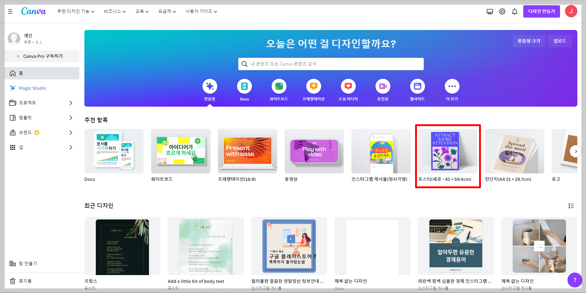 오늘 시화전은 포스터 사이즈를 사용해 만들 예정입니다. 여기에서 포스터가 아니라 인스타그램 게시물 사이즈나 스토리 등으로 만드실 분들은 원하는 템플릿을 선택하셔도 됩니다. 템플릿 차이만 있을 뿐 만드는 방법은 똑같습니다.