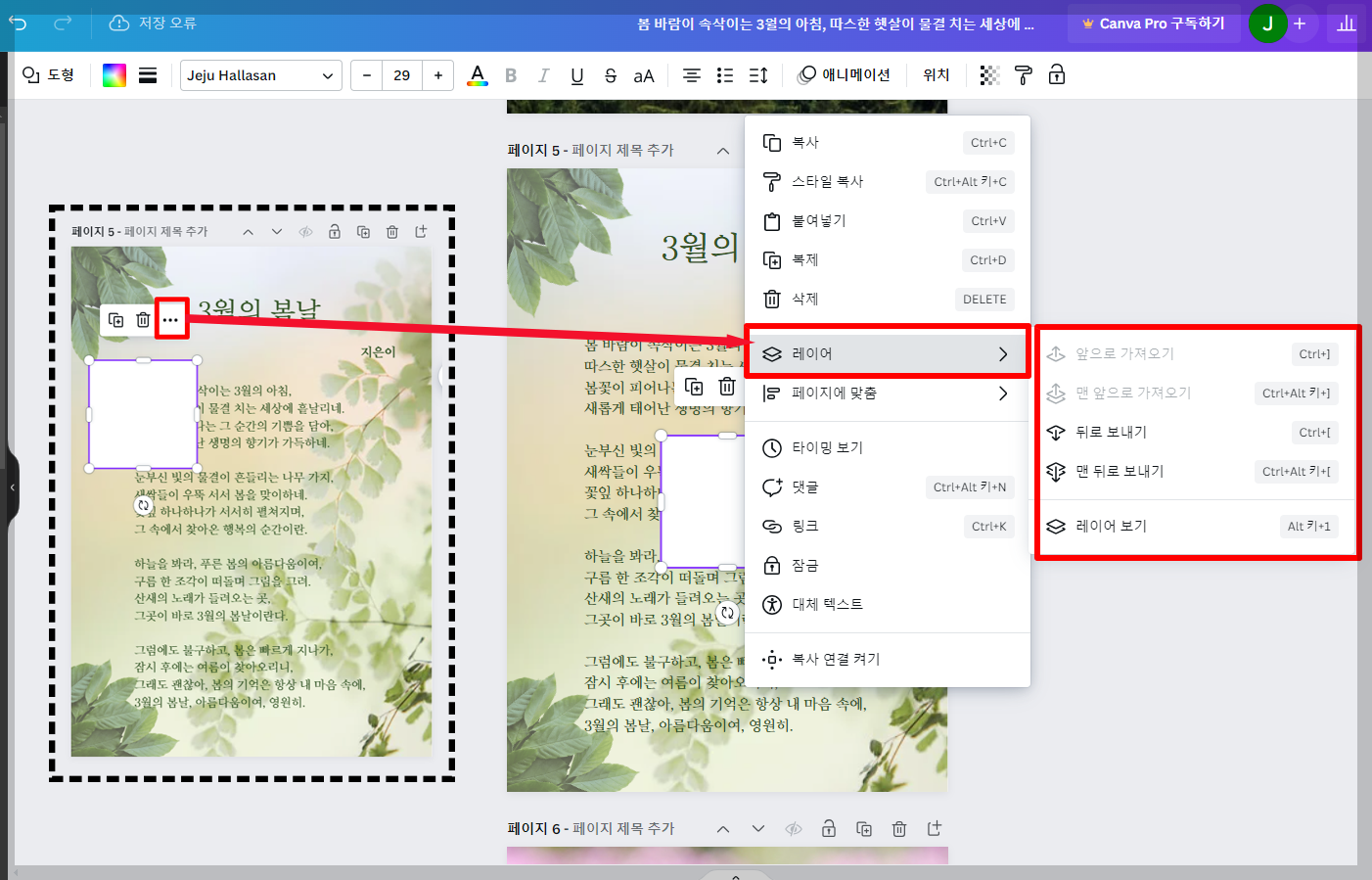 예를 들어, 위에 이미지에서 사각 도형을 텍스트 바로 밑에 배경처럼 투명도를 조절해 넣기 위해서는 사각 도형을 선택하면 나타나는 바로 위 점 세 개를 클릭하면 레이어 순서를 조절할 수 있습니다. 이때, 텍스트는 '맨뒤로 보내기'가 아닌 '뒤로 보내기'를 선택하시면 됩니다.
