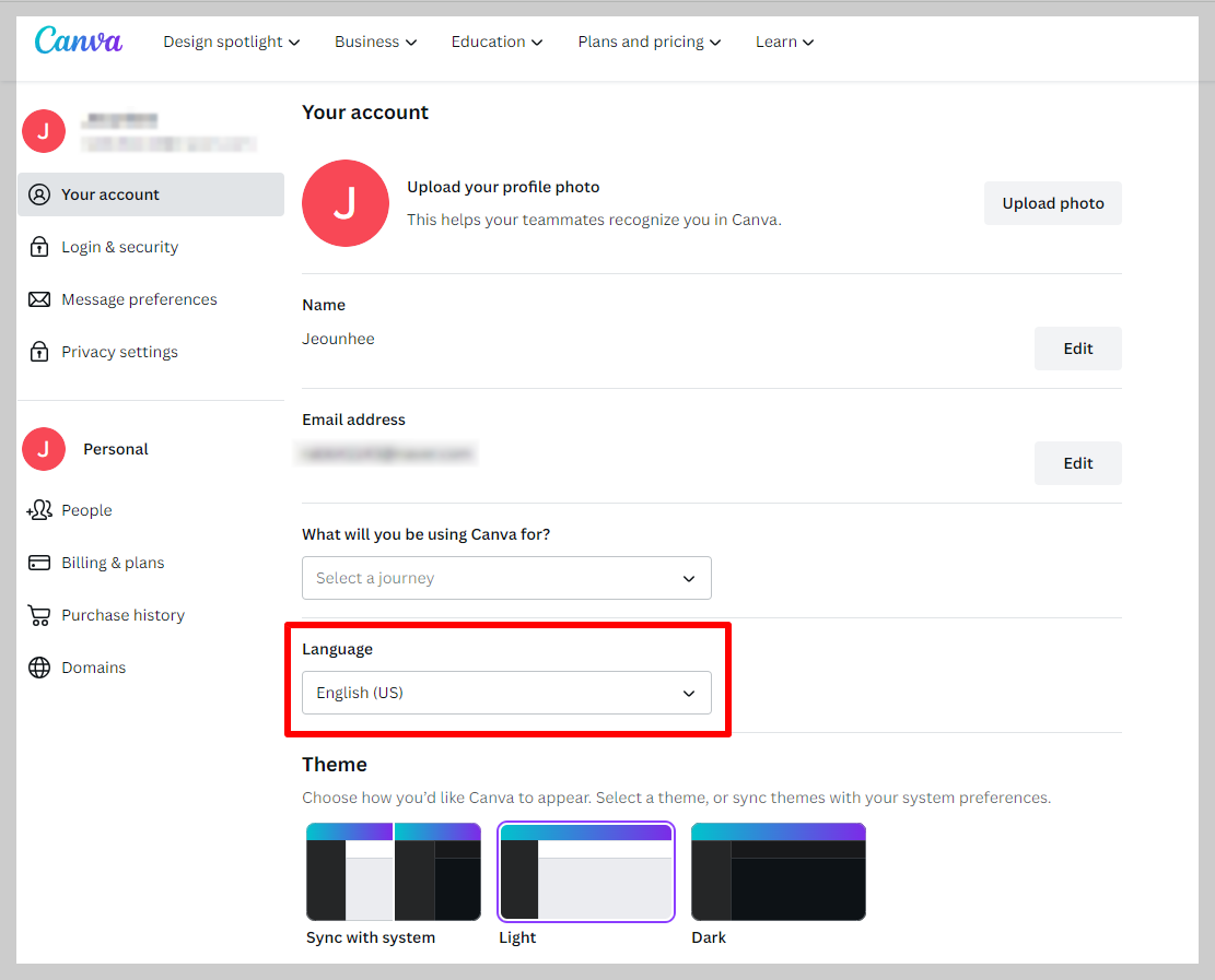 캔바는 오스트레일리아에서 만든 디자인 플랫폼으로, 처음 사이트에 들어가면 영어로 되어 있습니다. 이때, 당황하지 마시고 상단에 있는 톱니바퀴 모양의 '설정'에서 언어를 '한국어'로 바꿔주시면 됩니다.