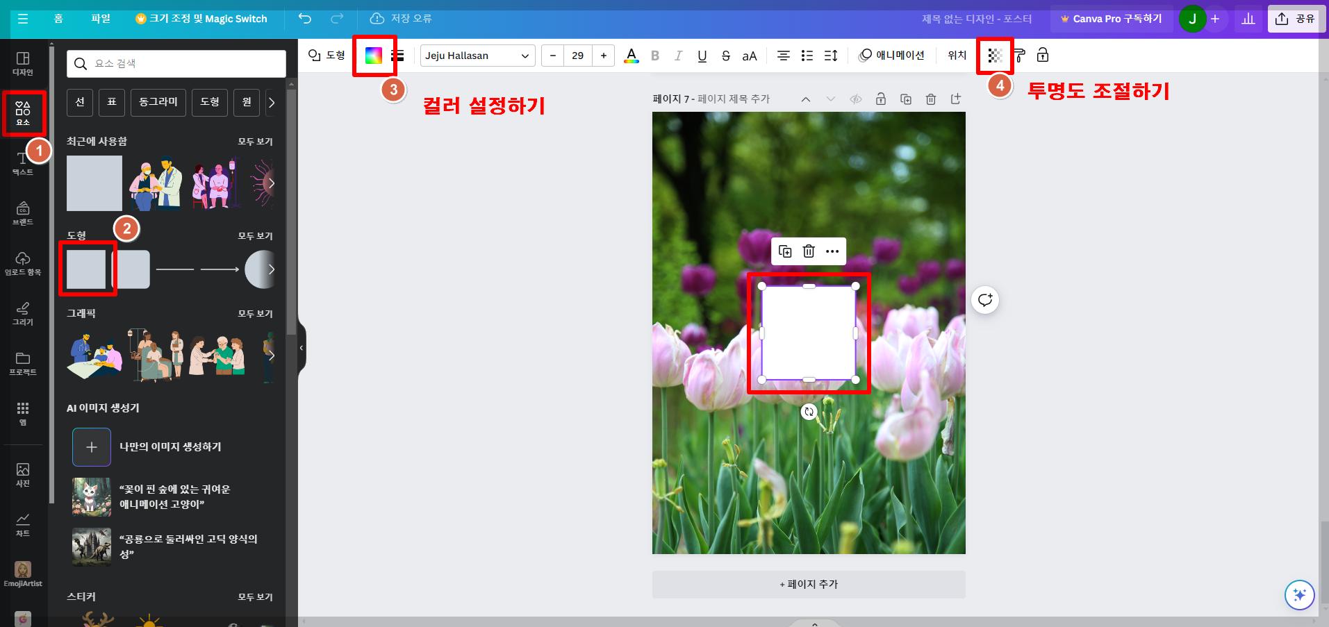 시화전 포스터에 투명도를 조절한 사각 도형 사용으로 가독성은 높이고 훨씬 더 세련된 디자인을 만들 수 있습니다. 만드는 방법은, 왼쪽 메뉴툴에서 '요소 → 사각 도형 선택 → 컬러 결정 →투명도 조절하기' 순으로 작업하시면 됩니다.