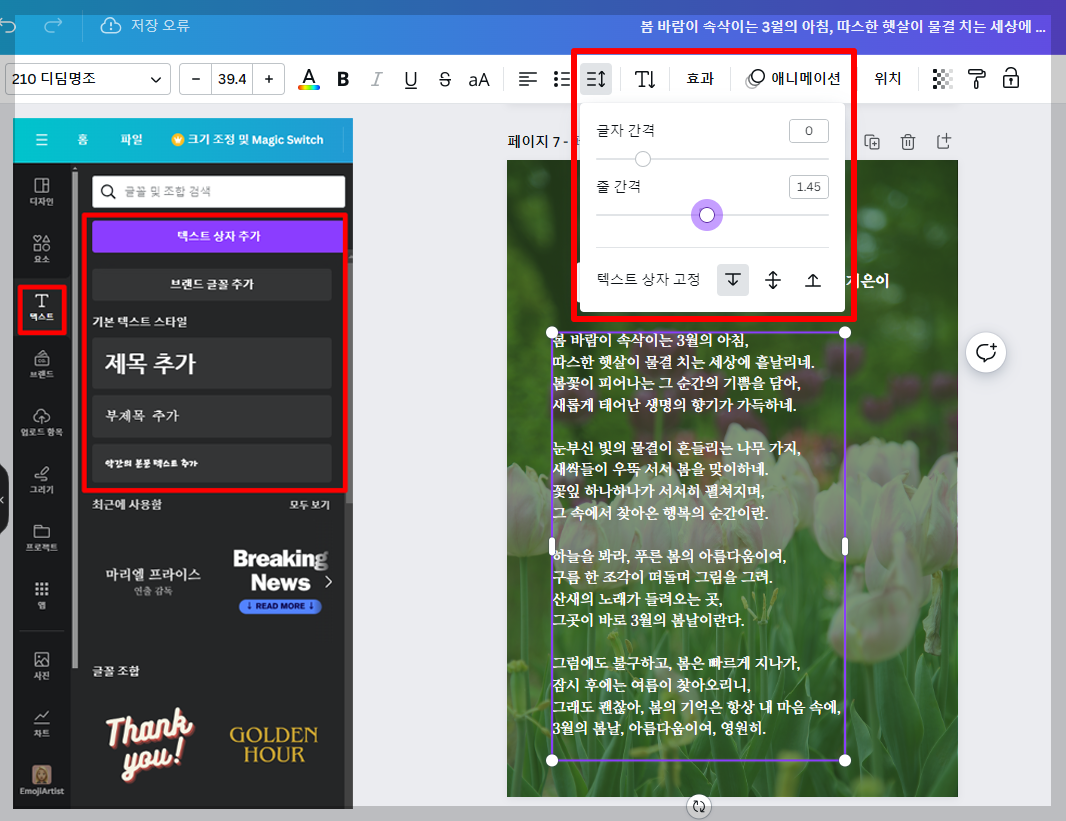 폰트를 설정할 때, 너무 요란한 디자인 폰트보다는 디딤 명조나 캔바 산스 고딕같은 기본 서체를 선택하시는 게 좋습니다. 시화전의 주인공은 누가 뭐래도 '시'입니다.