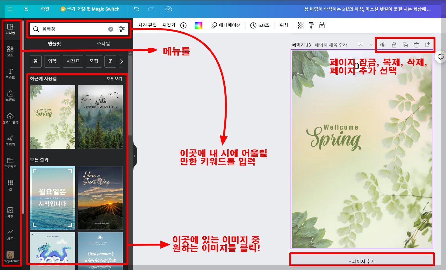 오른쪽이 내가 시화전 포스터를 만들 작업 공간이고, 왼쪽에 있는 것들이 디자인 작업 툴들입니다. 먼저, 왼쪽 상단에 있는 물음표가 있는 검색탭 공간에 내 시와 어울릴만한 키워드를 입력해 주세요.